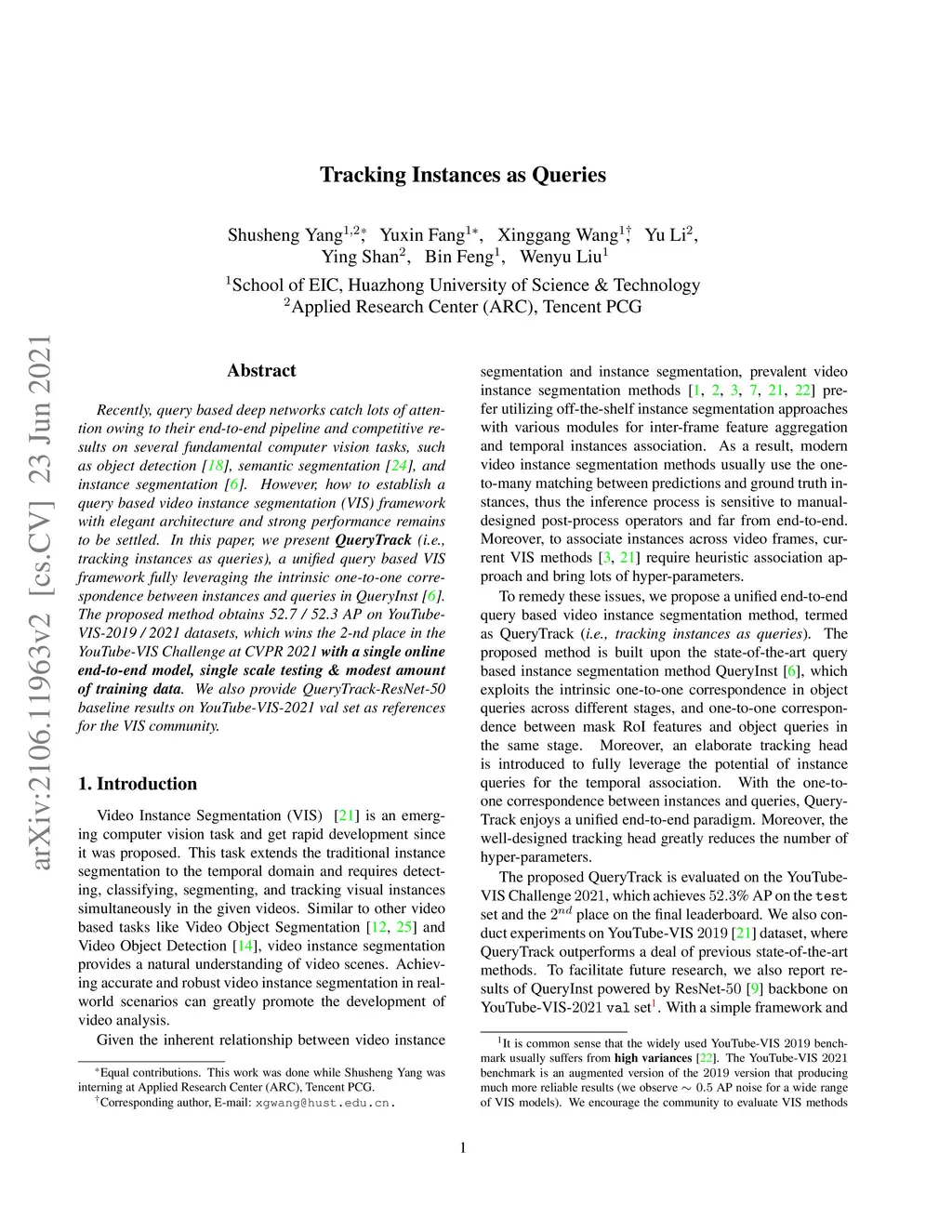 Recently, query based deep networks catch lots of attention owing to their end-to-end pipeline and competitive results on several fundamental computer vision tasks, such as object detection, semantic segmentation, and instance segmentation. However, how to establish a query based video instance segmentation (VIS) framework with elegant architecture and strong performance remains to be settled. In this paper, we present \textbf{QueryTrack} (i.e., tracking instances as queries), a unified query based VIS framework fully leveraging the intrinsic one-to-one correspondence between instances and queries in QueryInst. The proposed method obtains 52.7 / 52.3 AP on YouTube-VIS-2019 / 2021 datasets, which wins the 2-nd place in the YouTube-VIS Challenge at CVPR 2021 \textbf{with a single online end-to-end model, single scale testing \& modest amount of training data}. We also provide QueryTrack-ResNet-50 baseline results on YouTube-VIS-2021 val set as references for the VIS community.