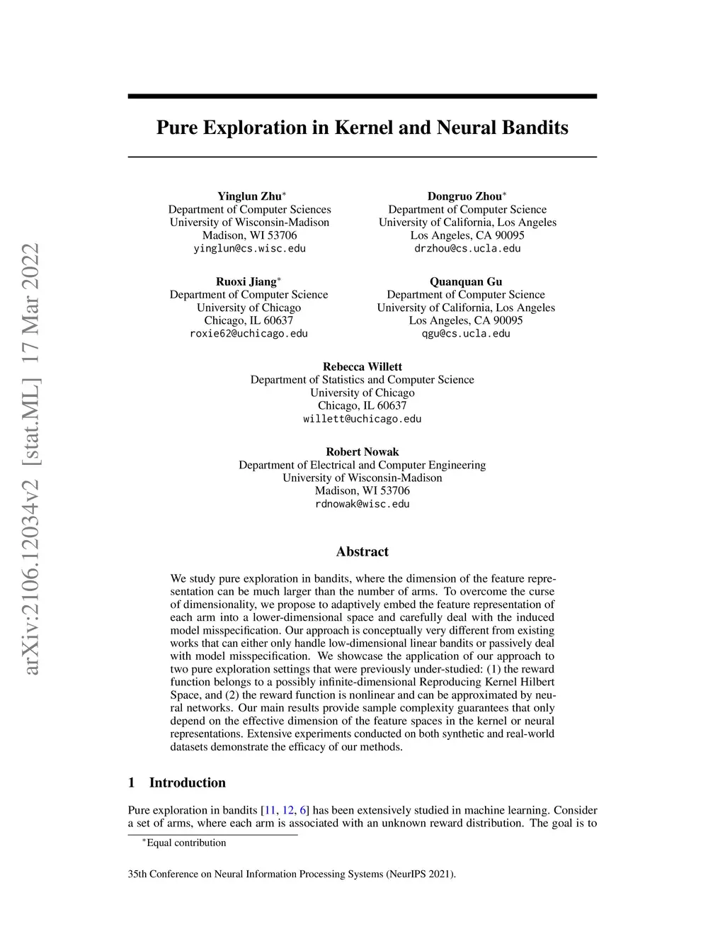 We study pure exploration in bandits, where the dimension of the feature representation can be much larger than the number of arms. To overcome the curse of dimensionality, we propose to adaptively embed the feature representation of each arm into a lower-dimensional space and carefully deal with the induced model misspecification. Our approach is conceptually very different from existing works that can either only handle low-dimensional linear bandits or passively deal with model misspecification. We showcase the application of our approach to two pure exploration settings that were previously under-studied: (1) the reward function belongs to a possibly infinite-dimensional Reproducing Kernel Hilbert Space, and (2) the reward function is nonlinear and can be approximated by neural networks. Our main results provide sample complexity guarantees that only depend on the effective dimension of the feature spaces in the kernel or neural representations. Extensive experiments conducted on both synthetic and real-world datasets demonstrate the efficacy of our methods.