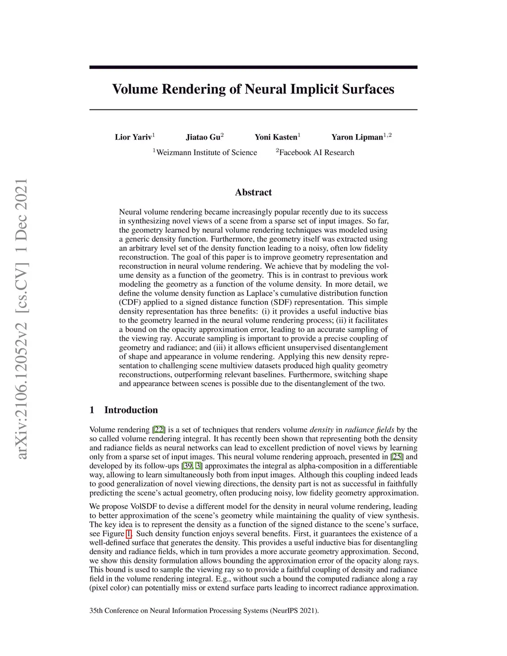 Neural volume rendering became increasingly popular recently due to its success in synthesizing novel views of a scene from a sparse set of input images. So far, the geometry learned by neural volume rendering techniques was modeled using a generic density function. Furthermore, the geometry itself was extracted using an arbitrary level set of the density function leading to a noisy, often low fidelity reconstruction. The goal of this paper is to improve geometry representation and reconstruction in neural volume rendering. We achieve that by modeling the volume density as a function of the geometry. This is in contrast to previous work modeling the geometry as a function of the volume density. In more detail, we define the volume density function as Laplace's cumulative distribution function (CDF) applied to a signed distance function (SDF) representation. This simple density representation has three benefits: (i) it provides a useful inductive bias to the geometry learned in the neural volume rendering process; (ii) it facilitates a bound on the opacity approximation error, leading to an accurate sampling of the viewing ray. Accurate sampling is important to provide a precise coupling of geometry and radiance; and (iii) it allows efficient unsupervised disentanglement of shape and appearance in volume rendering. Applying this new density representation to challenging scene multiview datasets produced high quality geometry reconstructions, outperforming relevant baselines. Furthermore, switching shape and appearance between scenes is possible due to the disentanglement of the two.