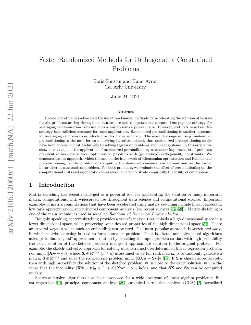 Recent literature has advocated the use of randomized methods for accelerating the solution of various matrix problems arising throughout data science and computational science. One popular strategy for leveraging randomization is to use it as a way to reduce problem size. However, methods based on this strategy lack sufficient accuracy for some applications. Randomized preconditioning is another approach for leveraging randomization, which provides higher accuracy. The main challenge in using randomized preconditioning is the need for an underlying iterative method, thus randomized preconditioning so far have been applied almost exclusively to solving regression problems and linear systems. In this article, we show how to expand the application of randomized preconditioning to another important set of problems prevalent across data science: optimization problems with (generalized) orthogonality constraints. We demonstrate our approach, which is based on the framework of Riemannian optimization and Riemannian preconditioning, on the problem of computing the dominant canonical correlations and on the Fisher linear discriminant analysis problem. For both problems, we evaluate the effect of preconditioning on the computational costs and asymptotic convergence, and demonstrate empirically the utility of our approach.