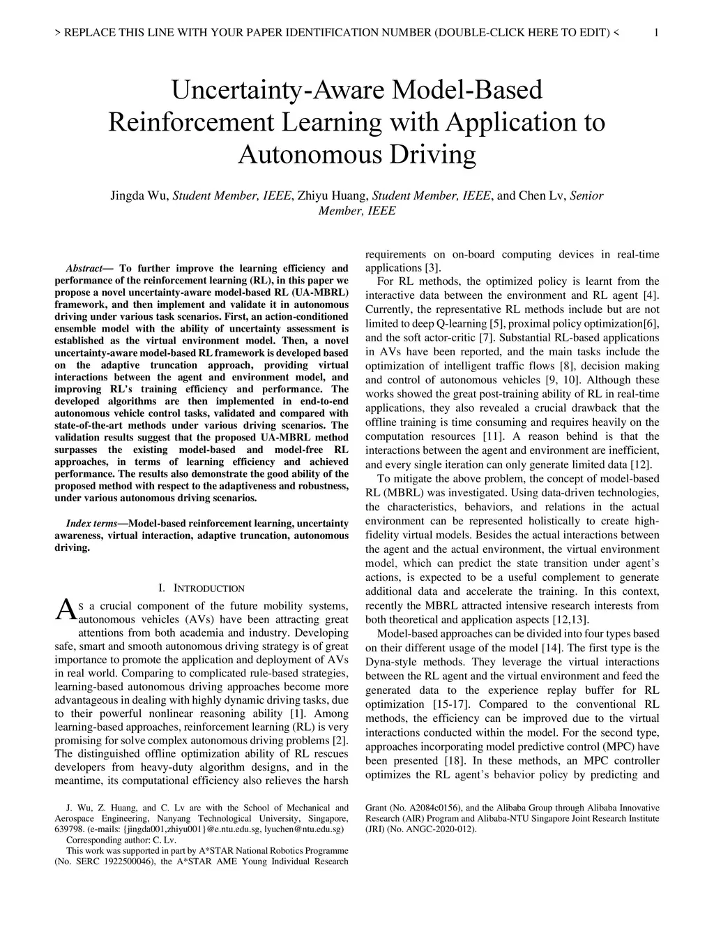 To further improve the learning efficiency and performance of reinforcement learning (RL), in this paper we propose a novel uncertainty-aware model-based RL (UA-MBRL) framework, and then implement and validate it in autonomous driving under various task scenarios. First, an action-conditioned ensemble model with the ability of uncertainty assessment is established as the virtual environment model. Then, a novel uncertainty-aware model-based RL framework is developed based on the adaptive truncation approach, providing virtual interactions between the agent and environment model, and improving RL's training efficiency and performance. The developed algorithms are then implemented in end-to-end autonomous vehicle control tasks, validated and compared with state-of-the-art methods under various driving scenarios. The validation results suggest that the proposed UA-MBRL method surpasses the existing model-based and model-free RL approaches, in terms of learning efficiency and achieved performance. The results also demonstrate the good ability of the proposed method with respect to the adaptiveness and robustness, under various autonomous driving scenarios.