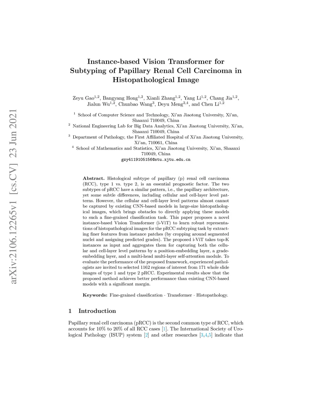 Instance-based Vision Transformer for Subtyping of Papillary Renal Cell