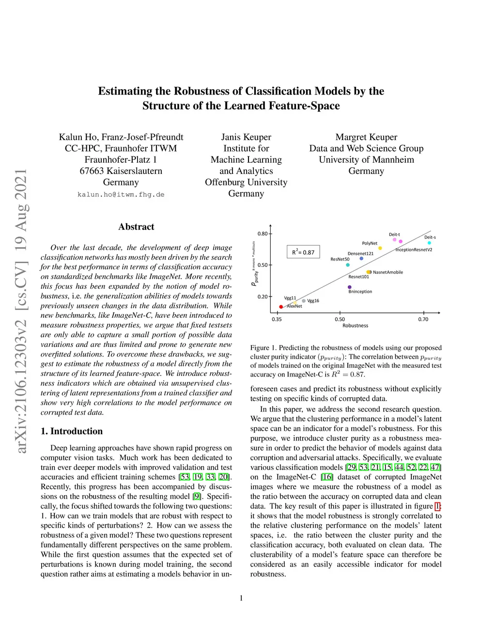Over the last decade, the development of deep image classification networks has mostly been driven by the search for the best performance in terms of classification accuracy on standardized benchmarks like ImageNet. More recently, this focus has been expanded by the notion of model robustness, \ie the generalization abilities of models towards previously unseen changes in the data distribution. While new benchmarks, like ImageNet-C, have been introduced to measure robustness properties, we argue that fixed testsets are only able to capture a small portion of possible data variations and are thus limited and prone to generate new overfitted solutions. To overcome these drawbacks, we suggest to estimate the robustness of a model directly from the structure of its learned feature-space. We introduce robustness indicators which are obtained via unsupervised clustering of latent representations from a trained classifier and show very high correlations to the model performance on corrupted test data.