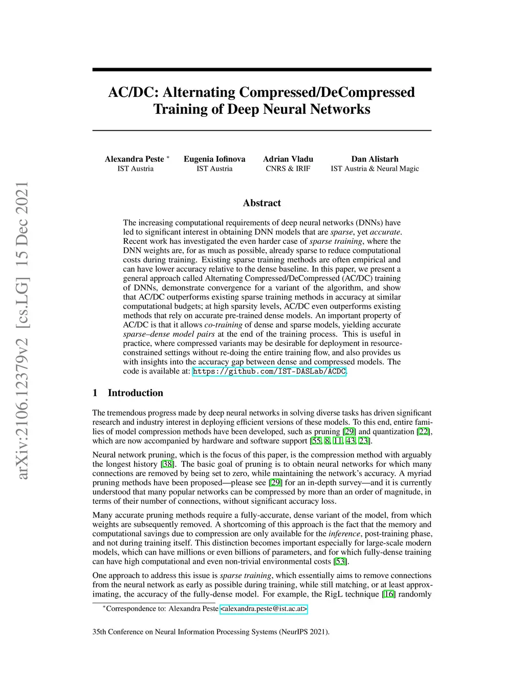 The increasing computational requirements of deep neural networks (DNNs) have led to significant interest in obtaining DNN models that are sparse, yet accurate. Recent work has investigated the even harder case of sparse training, where the DNN weights are, for as much as possible, already sparse to reduce computational costs during training. Existing sparse training methods are often empirical and can have lower accuracy relative to the dense baseline. In this paper, we present a general approach called Alternating Compressed/DeCompressed (AC/DC) training of DNNs, demonstrate convergence for a variant of the algorithm, and show that AC/DC outperforms existing sparse training methods in accuracy at similar computational budgets; at high sparsity levels, AC/DC even outperforms existing methods that rely on accurate pre-trained dense models. An important property of AC/DC is that it allows co-training of dense and sparse models, yielding accurate sparse-dense model pairs at the end of the training process. This is useful in practice, where compressed variants may be desirable for deployment in resource-constrained settings without re-doing the entire training flow, and also provides us with insights into the accuracy gap between dense and compressed models. The code is available at: https://github.com/IST-DASLab/ACDC .