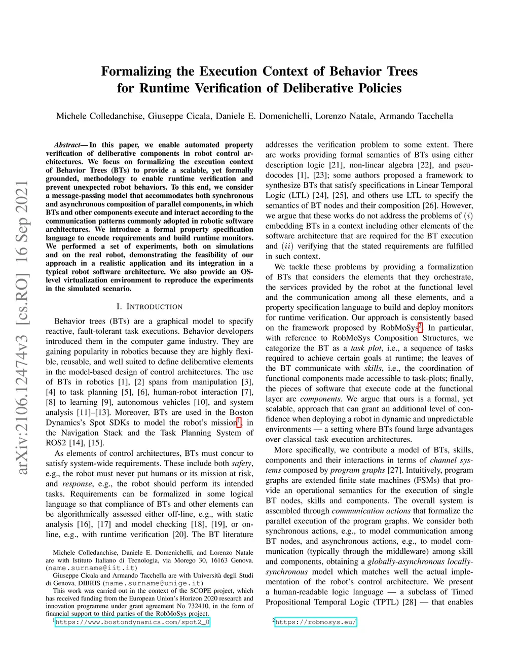 In this paper, we enable automated property verification of deliberative components in robot control architectures. We focus on formalizing the execution context of Behavior Trees (BTs) to provide a scalable, yet formally grounded, methodology to enable runtime verification and prevent unexpected robot behaviors. To this end, we consider a message-passing model that accommodates both synchronous and asynchronous composition of parallel components, in which BTs and other components execute and interact according to the communication patterns commonly adopted in robotic software architectures. We introduce a formal property specification language to encode requirements and build runtime monitors. We performed a set of experiments, both on simulations and on the real robot, demonstrating the feasibility of our approach in a realistic application and its integration in a typical robot software architecture. We also provide an OS-level virtualization environment to reproduce the experiments in the simulated scenario.