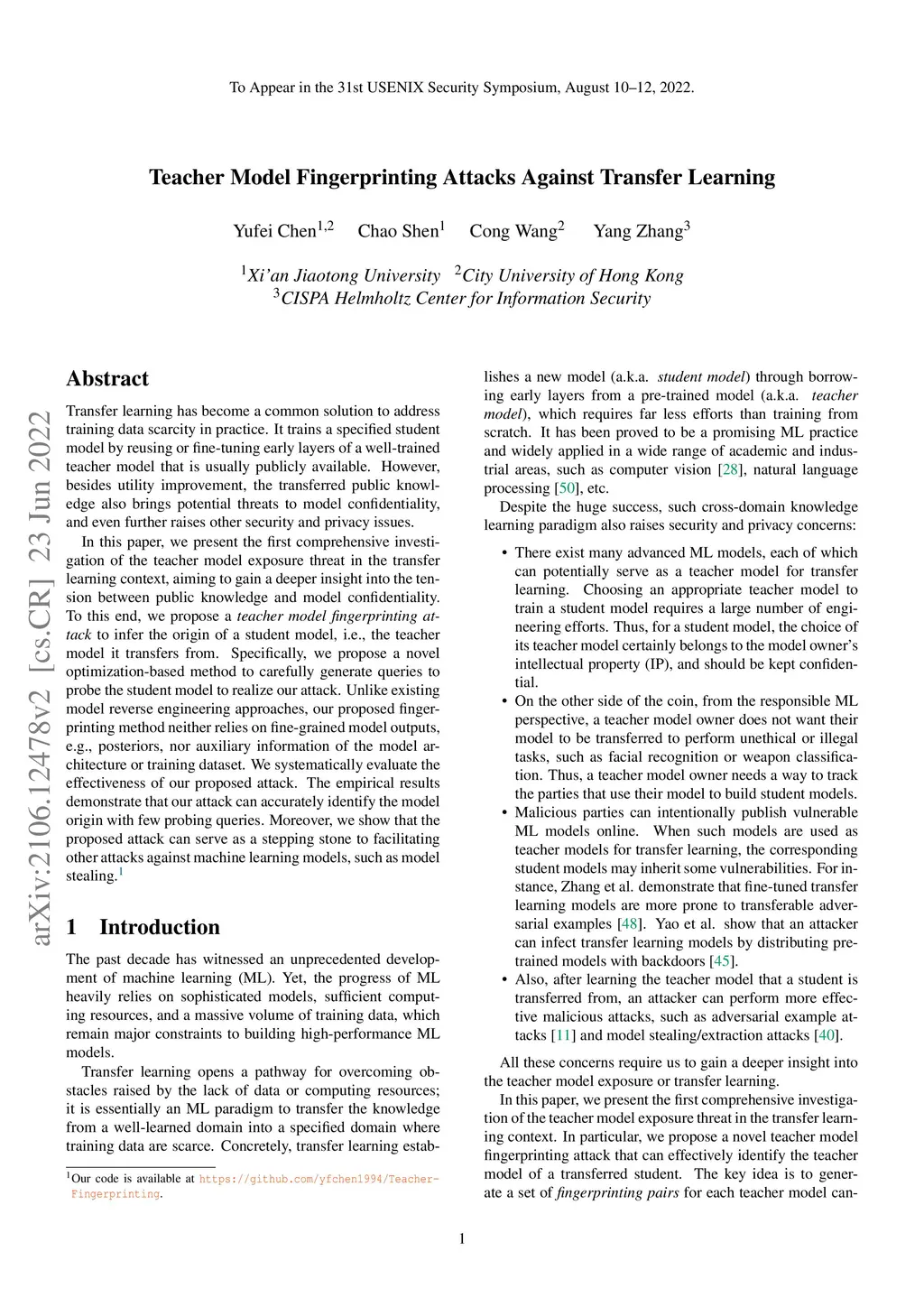 Transfer learning has become a common solution to address training data scarcity in practice. It trains a specified student model by reusing or fine-tuning early layers of a well-trained teacher model that is usually publicly available. However, besides utility improvement, the transferred public knowledge also brings potential threats to model confidentiality, and even further raises other security and privacy issues. In this paper, we present the first comprehensive investigation of the teacher model exposure threat in the transfer learning context, aiming to gain a deeper insight into the tension between public knowledge and model confidentiality. To this end, we propose a teacher model fingerprinting attack to infer the origin of a student model, i.e., the teacher model it transfers from. Specifically, we propose a novel optimization-based method to carefully generate queries to probe the student model to realize our attack. Unlike existing model reverse engineering approaches, our proposed fingerprinting method neither relies on fine-grained model outputs, e.g., posteriors, nor auxiliary information of the model architecture or training dataset. We systematically evaluate the effectiveness of our proposed attack. The empirical results demonstrate that our attack can accurately identify the model origin with few probing queries. Moreover, we show that the proposed attack can serve as a stepping stone to facilitating other attacks against machine learning models, such as model stealing.