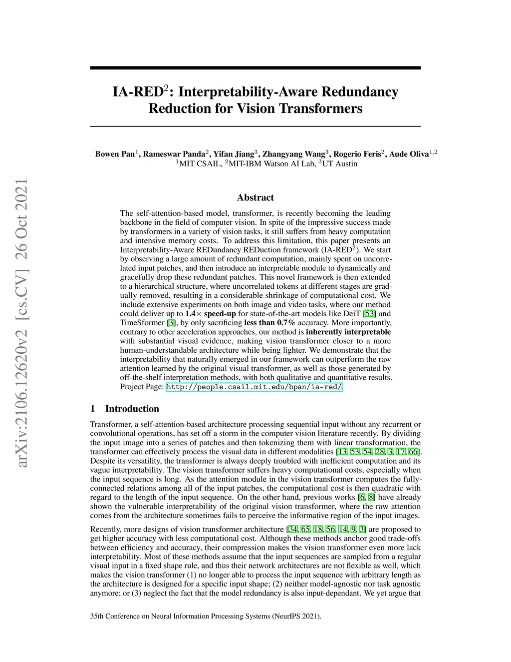 The self-attention-based model, transformer, is recently becoming the leading backbone in the field of computer vision. In spite of the impressive success made by transformers in a variety of vision tasks, it still suffers from heavy computation and intensive memory costs. To address this limitation, this paper presents an Interpretability-Aware REDundancy REDuction framework (IA-RED). We start by observing a large amount of redundant computation, mainly spent on uncorrelated input patches, and then introduce an interpretable module to dynamically and gracefully drop these redundant patches. This novel framework is then extended to a hierarchical structure, where uncorrelated tokens at different stages are gradually removed, resulting in a considerable shrinkage of computational cost. We include extensive experiments on both image and video tasks, where our method could deliver up to 1.4x speed-up for state-of-the-art models like DeiT and TimeSformer, by only sacrificing less than 0.7% accuracy. More importantly, contrary to other acceleration approaches, our method is inherently interpretable with substantial visual evidence, making vision transformer closer to a more human-understandable architecture while being lighter. We demonstrate that the interpretability that naturally emerged in our framework can outperform the raw attention learned by the original visual transformer, as well as those generated by off-the-shelf interpretation methods, with both qualitative and quantitative results. Project Page: http://people.csail.mit.edu/bpan/ia-red/.