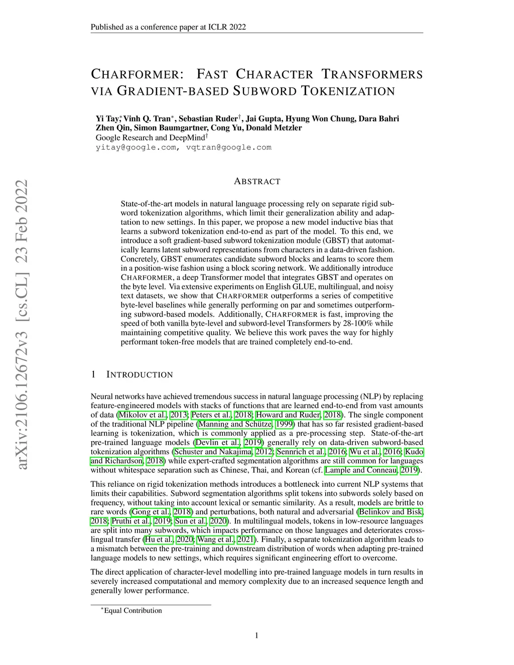 Charformer: Fast Character Transformers via Gradient-based Subword Tokenization