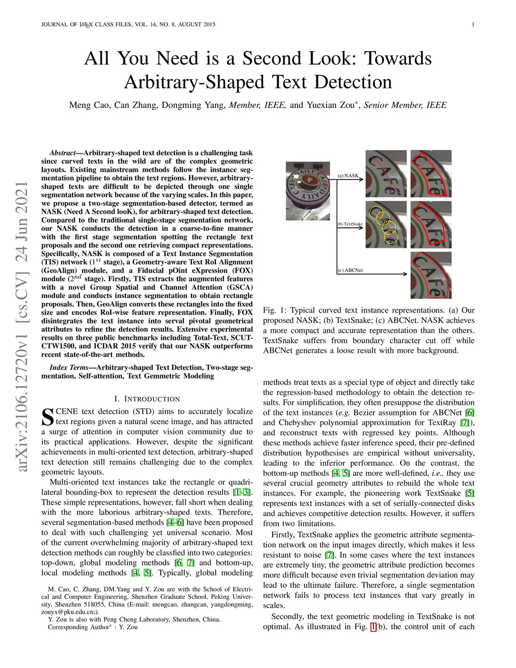 Arbitrary-shaped text detection is a challenging task since curved texts in the wild are of the complex geometric layouts. Existing mainstream methods follow the instance segmentation pipeline to obtain the text regions. However, arbitraryshaped texts are difficult to be depicted through one single segmentation network because of the varying scales. In this paper, we propose a two-stage segmentation-based detector, termed as NASK (Need A Second looK), for arbitrary-shaped text detection. Compared to the traditional single-stage segmentation network, our NASK conducts the detection in a coarse-to-fine manner with the first stage segmentation spotting the rectangle text proposals and the second one retrieving compact representations. Specifically, NASK is composed of a Text Instance Segmentation (TIS) network (1st stage), a Geometry-aware Text RoI Alignment (GeoAlign) module, and a Fiducial pOint eXpression (FOX) module (2nd stage). Firstly, TIS extracts the augmented features with a novel Group Spatial and Channel Attention (GSCA) module and conducts instance segmentation to obtain rectangle proposals. Then, GeoAlign converts these rectangles into the fixed size and encodes RoI-wise feature representation. Finally, FOX disintegrates the text instance into serval pivotal geometrical attributes to refine the detection results. Extensive experimental results on three public benchmarks including Total-Text, SCUTCTW1500, and ICDAR 2015 verify that our NASK outperforms recent state-of-the-art methods.
