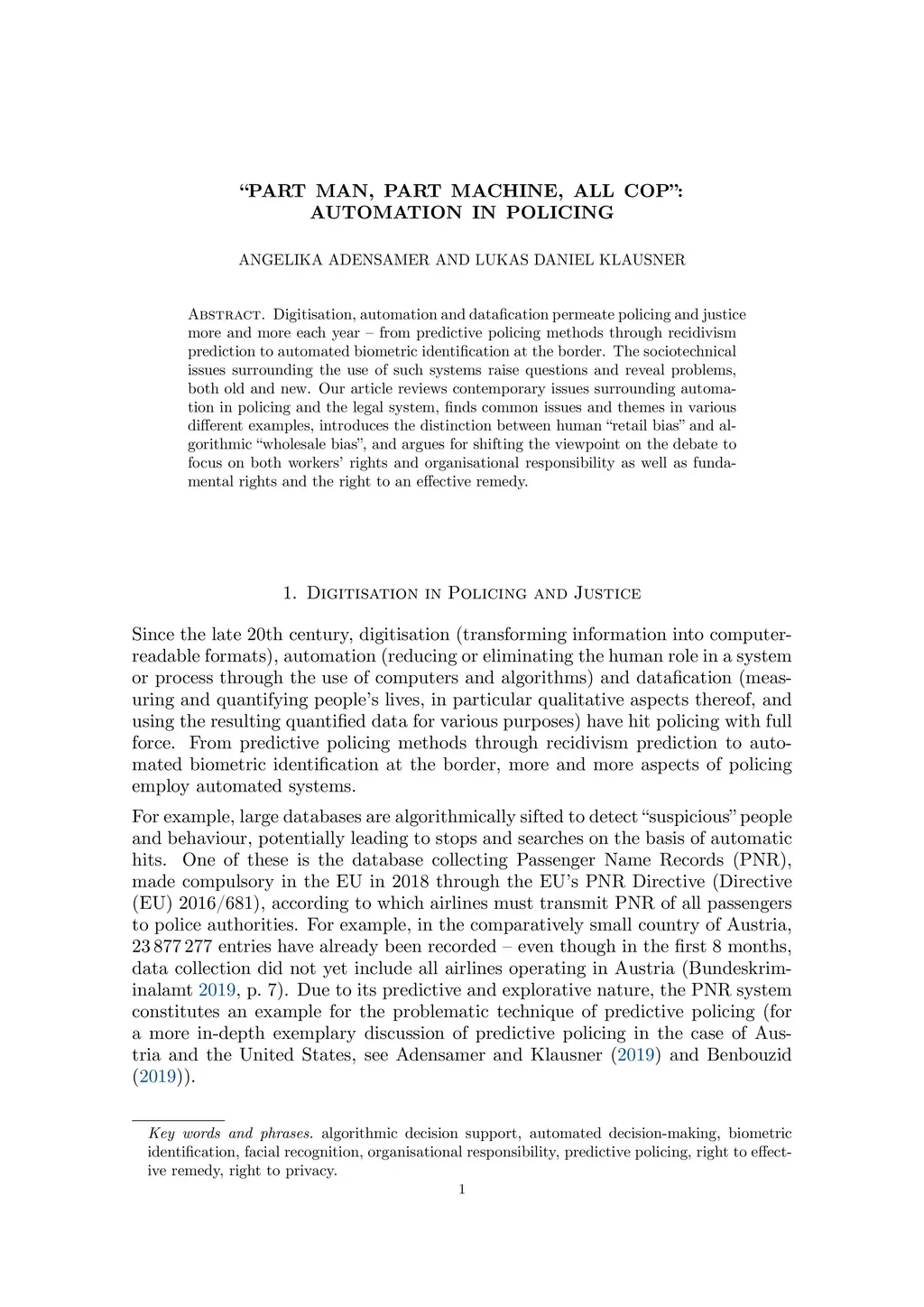 Digitisation, automation and datafication permeate policing and justice more and more each year -- from predictive policing methods through recidivism prediction to automated biometric identification at the border. The sociotechnical issues surrounding the use of such systems raise questions and reveal problems, both old and new. Our article reviews contemporary issues surrounding automation in policing and the legal system, finds common issues and themes in various different examples, introduces the distinction between human "retail bias" and algorithmic "wholesale bias", and argues for shifting the viewpoint on the debate to focus on both workers' rights and organisational responsibility as well as fundamental rights and the right to an effective remedy.