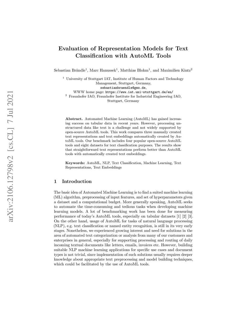 Automated Machine Learning (AutoML) has gained increasing success on tabular data in recent years. However, processing unstructured data like text is a challenge and not widely supported by open-source AutoML tools. This work compares three manually created text representations and text embeddings automatically created by AutoML tools. Our benchmark includes four popular open-source AutoML tools and eight datasets for text classification purposes. The results show that straightforward text representations perform better than AutoML tools with automatically created text embeddings.