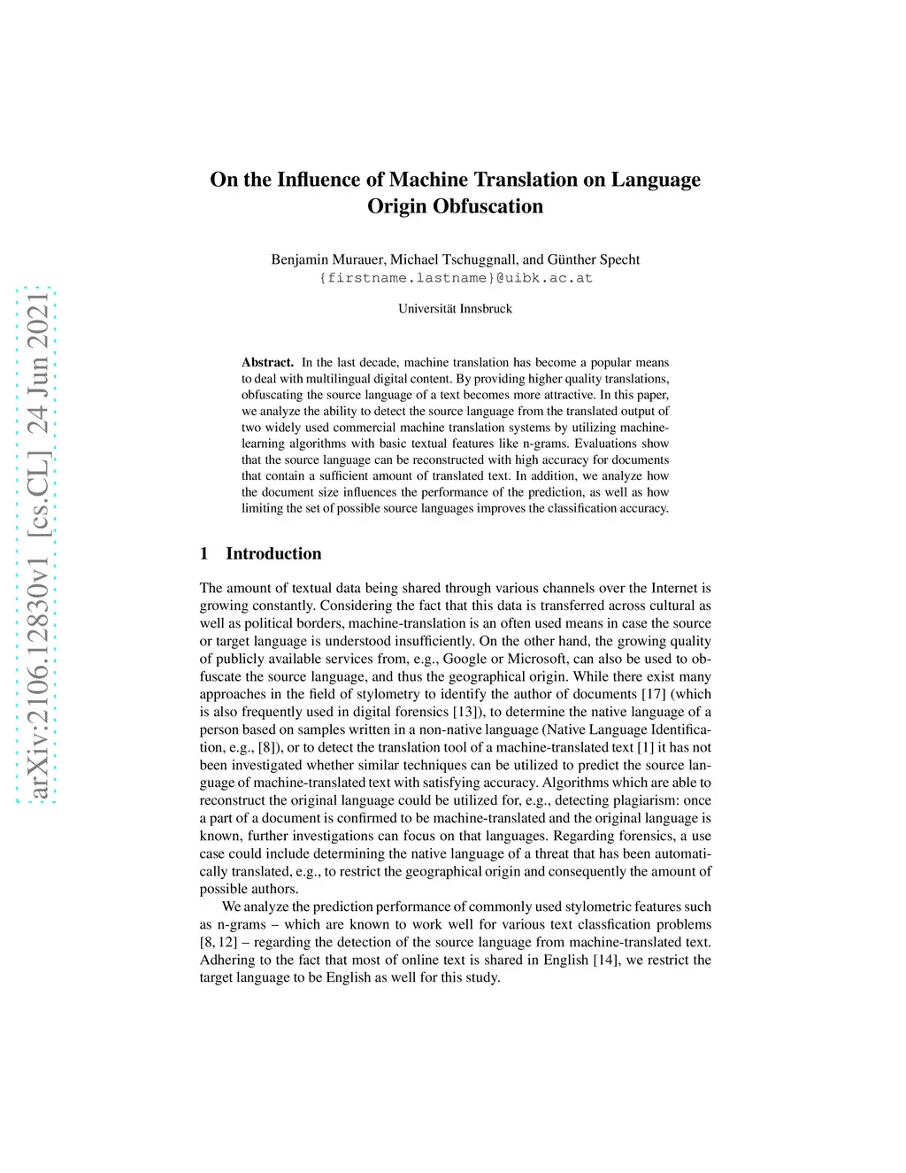 In the last decade, machine translation has become a popular means to deal with multilingual digital content. By providing higher quality translations, obfuscating the source language of a text becomes more attractive. In this paper, we analyze the ability to detect the source language from the translated output of two widely used commercial machine translation systems by utilizing machine-learning algorithms with basic textual features like n-grams. Evaluations show that the source language can be reconstructed with high accuracy for documents that contain a sufficient amount of translated text. In addition, we analyze how the document size influences the performance of the prediction, as well as how limiting the set of possible source languages improves the classification accuracy.
