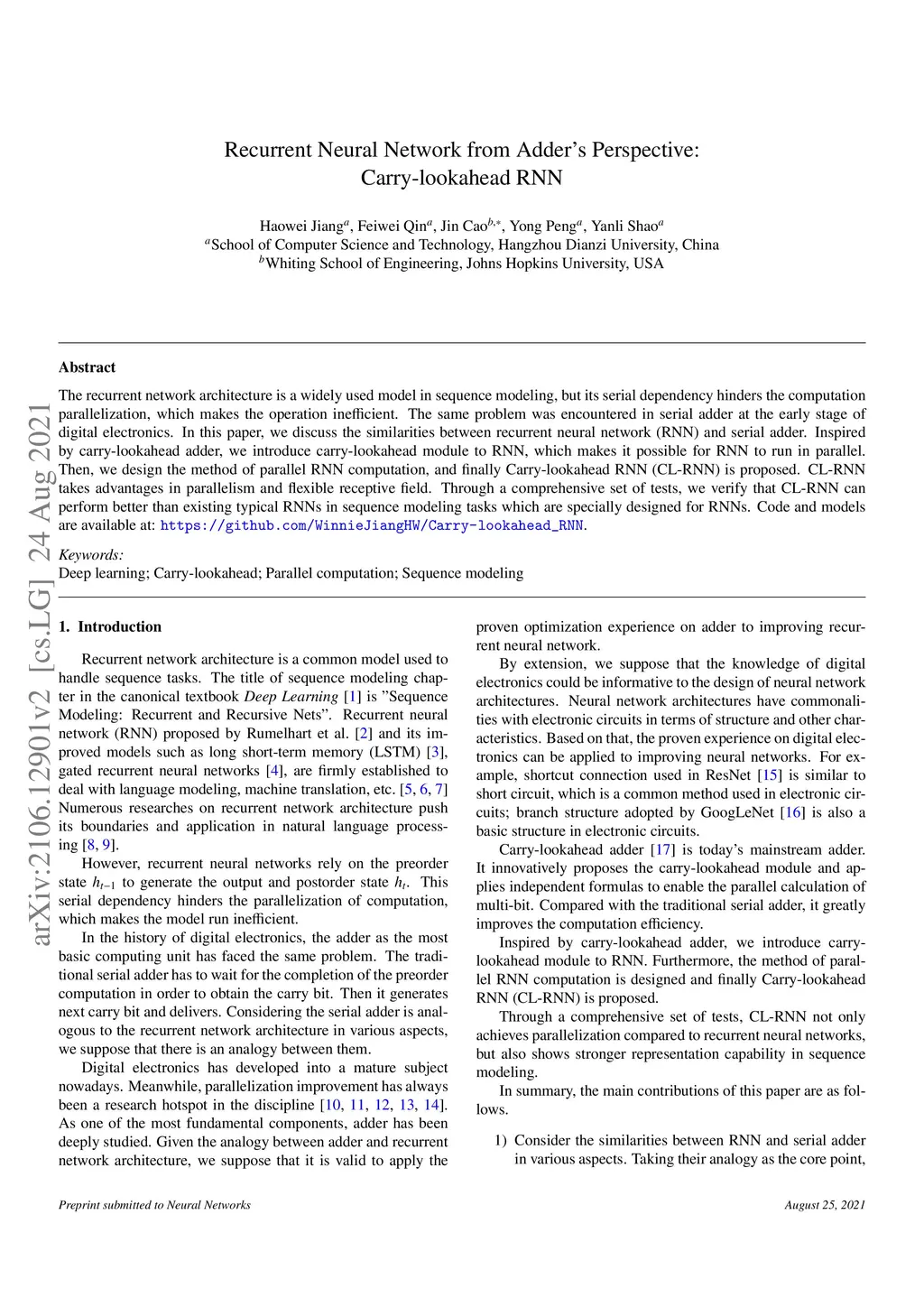 The recurrent network architecture is a widely used model in sequence modeling, but its serial dependency hinders the computation parallelization, which makes the operation inefficient. The same problem was encountered in serial adder at the early stage of digital electronics. In this paper, we discuss the similarities between recurrent neural network (RNN) and serial adder. Inspired by carry-lookahead adder, we introduce carry-lookahead module to RNN, which makes it possible for RNN to run in parallel. Then, we design the method of parallel RNN computation, and finally Carry-lookahead RNN (CL-RNN) is proposed. CL-RNN takes advantages in parallelism and flexible receptive field. Through a comprehensive set of tests, we verify that CL-RNN can perform better than existing typical RNNs in sequence modeling tasks which are specially designed for RNNs.