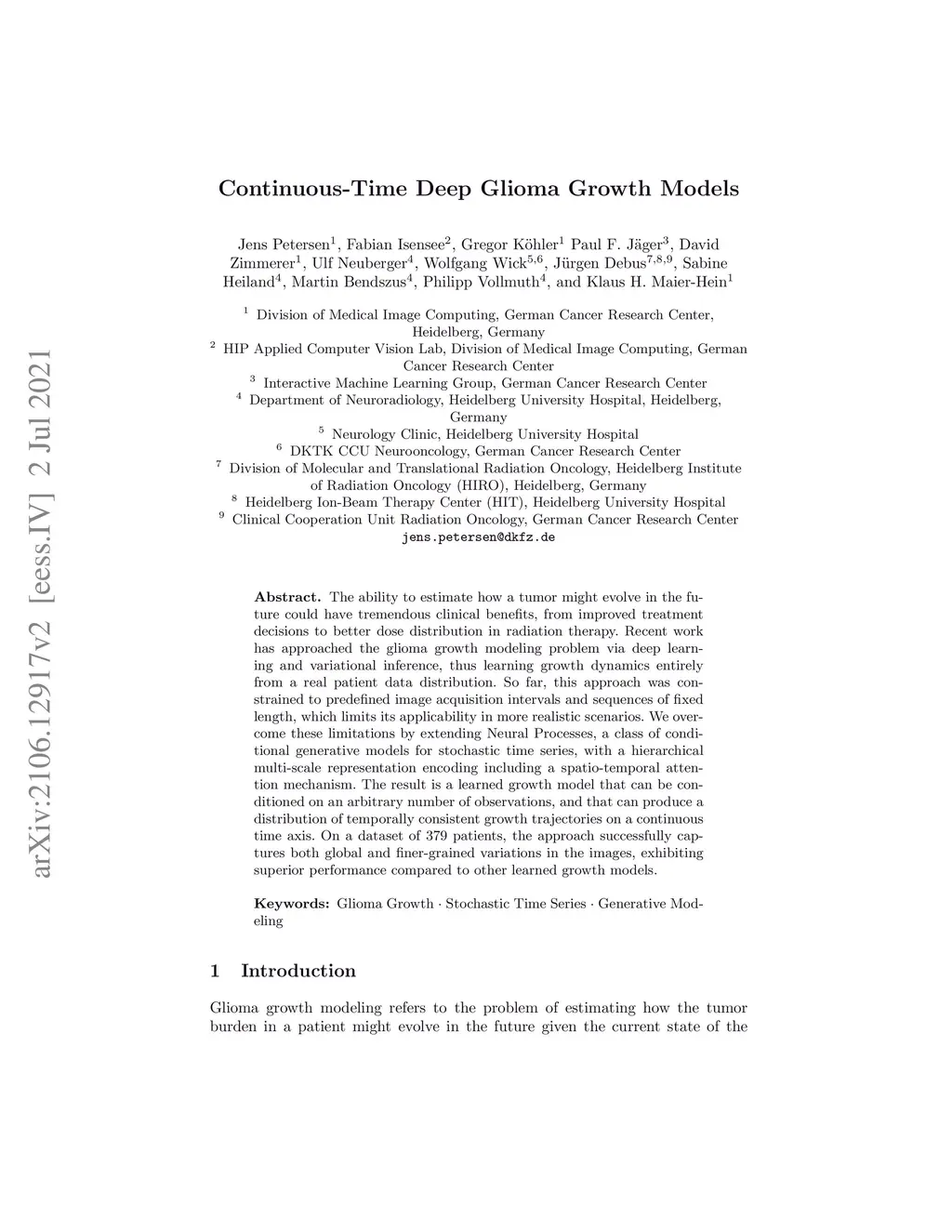 The ability to estimate how a tumor might evolve in the future could have tremendous clinical benefits, from improved treatment decisions to better dose distribution in radiation therapy. Recent work has approached the glioma growth modeling problem via deep learning and variational inference, thus learning growth dynamics entirely from a real patient data distribution. So far, this approach was constrained to predefined image acquisition intervals and sequences of fixed length, which limits its applicability in more realistic scenarios. We overcome these limitations by extending Neural Processes, a class of conditional generative models for stochastic time series, with a hierarchical multi-scale representation encoding including a spatio-temporal attention mechanism. The result is a learned growth model that can be conditioned on an arbitrary number of observations, and that can produce a distribution of temporally consistent growth trajectories on a continuous time axis. On a dataset of 379 patients, the approach successfully captures both global and finer-grained variations in the images, exhibiting superior performance compared to other learned growth models.