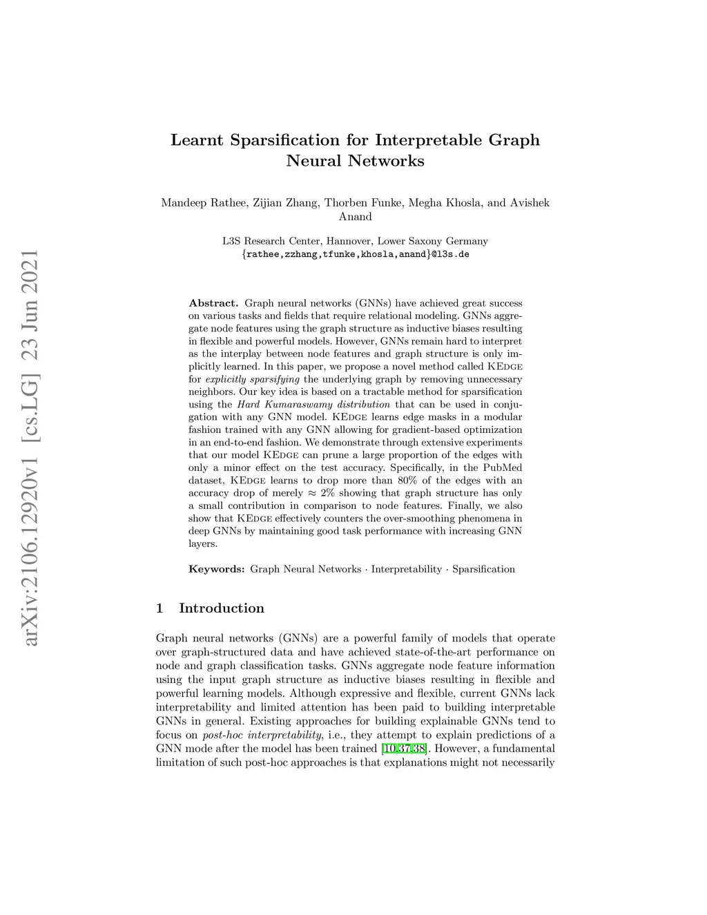 Graph neural networks (GNNs) have achieved great success on various tasks and fields that require relational modeling. GNNs aggregate node features using the graph structure as inductive biases resulting in flexible and powerful models. However, GNNs remain hard to interpret as the interplay between node features and graph structure is only implicitly learned. In this paper, we propose a novel method called Kedge for explicitly sparsifying the underlying graph by removing unnecessary neighbors. Our key idea is based on a tractable method for sparsification using the Hard Kumaraswamy distribution that can be used in conjugation with any GNN model. Kedge learns edge masks in a modular fashion trained with any GNN allowing for gradient based optimization in an end-to-end fashion. We demonstrate through extensive experiments that our model Kedge can prune a large proportion of the edges with only a minor effect on the test accuracy. Specifically, in the PubMed dataset, Kedge learns to drop more than 80% of the edges with an accuracy drop of merely 2% showing that graph structure has only a small contribution in comparison to node features. Finally, we also show that Kedge effectively counters the over-smoothing phenomena in deep GNNs by maintaining good task performance with increasing GNN layers.