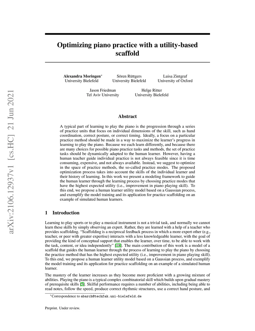 A typical part of learning to play the piano is the progression through a series of practice units that focus on individual dimensions of the skill, such as hand coordination, correct posture, or correct timing. Ideally, a focus on a particular practice method should be made in a way to maximize the learner's progress in learning to play the piano. Because we each learn differently, and because there are many choices for possible piano practice tasks and methods, the set of practice tasks should be dynamically adapted to the human learner. However, having a human teacher guide individual practice is not always feasible since it is time consuming, expensive, and not always available. Instead, we suggest to optimize in the space of practice methods, the so-called practice modes. The proposed optimization process takes into account the skills of the individual learner and their history of learning. In this work we present a modeling framework to guide the human learner through the learning process by choosing practice modes that have the highest expected utility (i.e., improvement in piano playing skill). To this end, we propose a human learner utility model based on a Gaussian process, and exemplify the model training and its application for practice scaffolding on an example of simulated human learners.