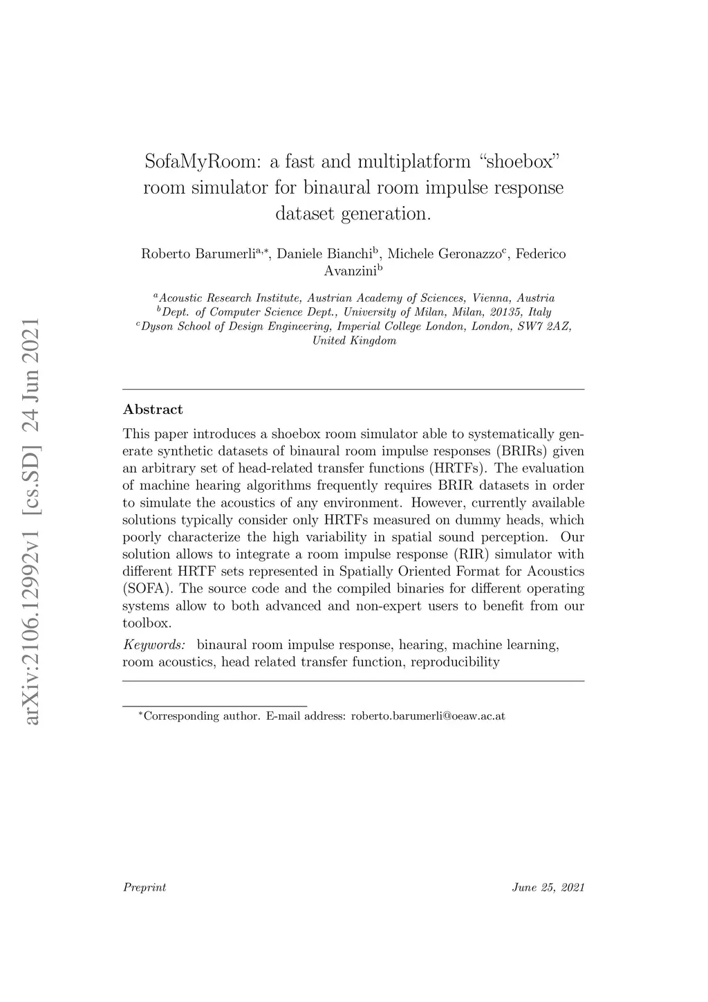 SofaMyRoom: a fast and multiplatform "shoebox" room simulator for