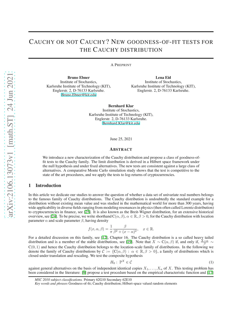 We introduce a new characterization of the Cauchy distribution and propose a class of goodness-of-fit tests to the Cauchy family. The limit distribution is derived in a Hilbert space framework under the null hypothesis and under fixed alternatives. The new tests are consistent against a large class of alternatives. A comparative Monte Carlo simulation study shows that the test is competitive to the state of the art procedures, and we apply the tests to log-returns of cryptocurrencies.