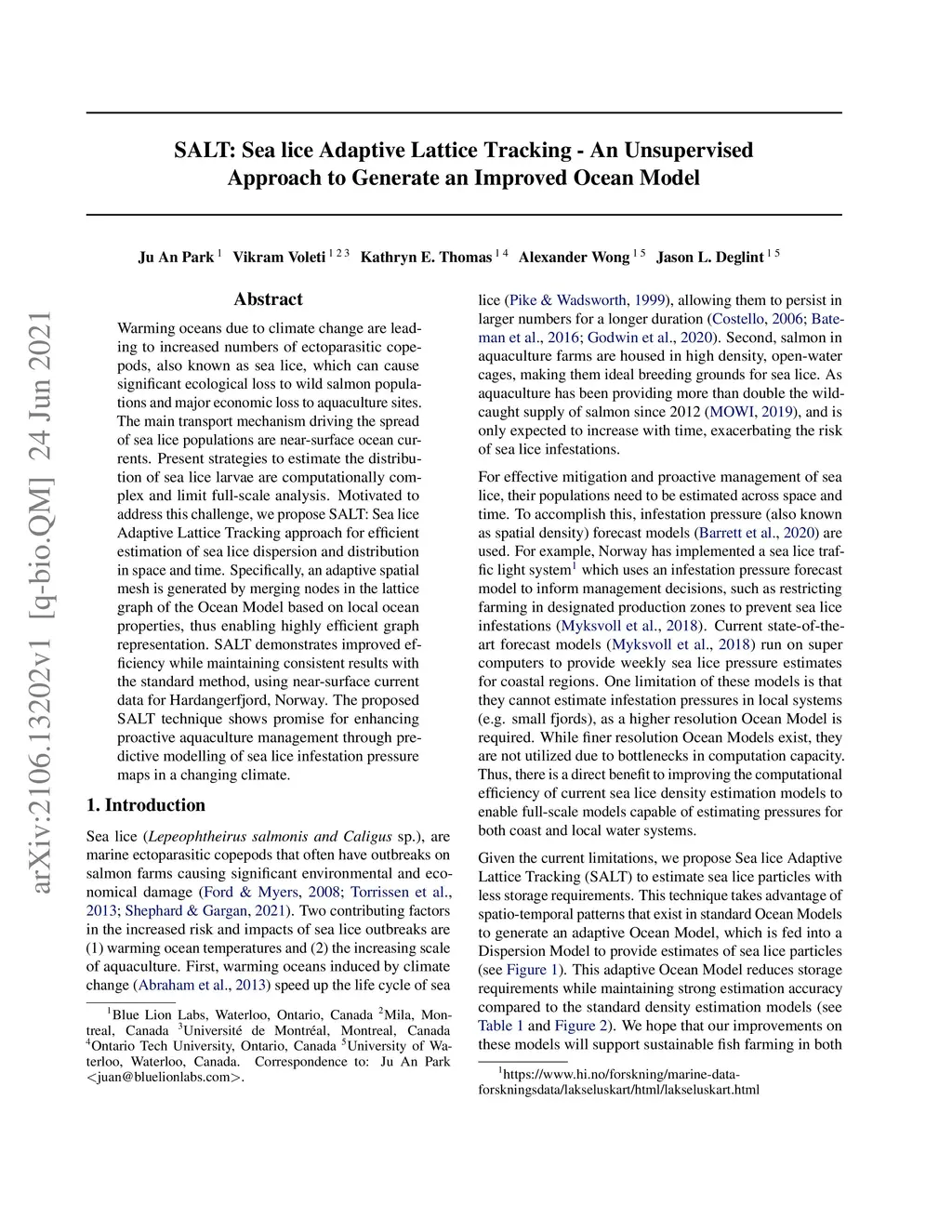 Warming oceans due to climate change are leading to increased numbers of ectoparasitic copepods, also known as sea lice, which can cause significant ecological loss to wild salmon populations and major economic loss to aquaculture sites. The main transport mechanism driving the spread of sea lice populations are near-surface ocean currents. Present strategies to estimate the distribution of sea lice larvae are computationally complex and limit full-scale analysis. Motivated to address this challenge, we propose SALT: Sea lice Adaptive Lattice Tracking approach for efficient estimation of sea lice dispersion and distribution in space and time. Specifically, an adaptive spatial mesh is generated by merging nodes in the lattice graph of the Ocean Model based on local ocean properties, thus enabling highly efficient graph representation. SALT demonstrates improved efficiency while maintaining consistent results with the standard method, using near-surface current data for Hardangerfjord, Norway. The proposed SALT technique shows promise for enhancing proactive aquaculture management through predictive modelling of sea lice infestation pressure maps in a changing climate.