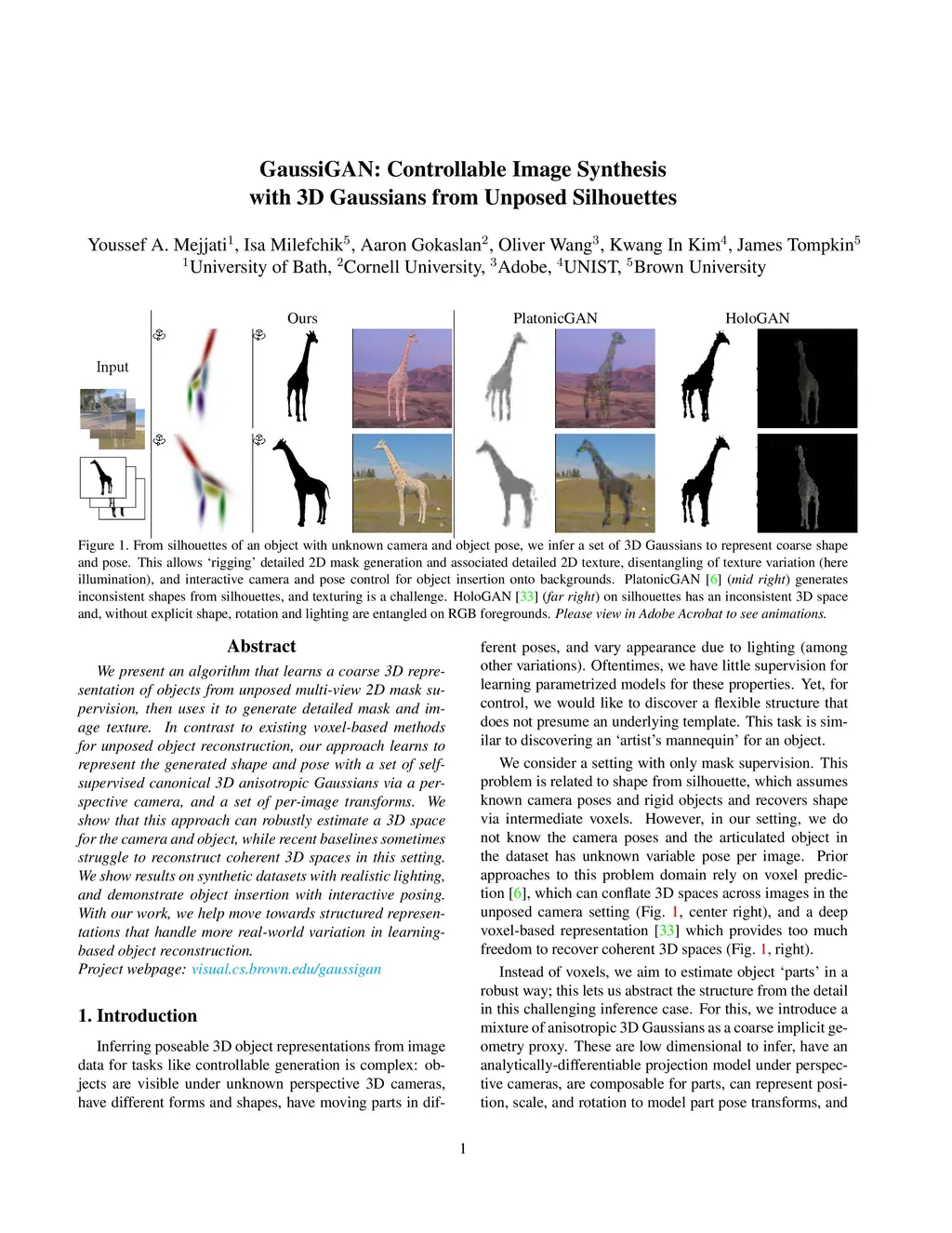 We present an algorithm that learns a coarse 3D representation of objects from unposed multi-view 2D mask supervision, then uses it to generate detailed mask and image texture. In contrast to existing voxel-based methods for unposed object reconstruction, our approach learns to represent the generated shape and pose with a set of self-supervised canonical 3D anisotropic Gaussians via a perspective camera, and a set of per-image transforms. We show that this approach can robustly estimate a 3D space for the camera and object, while recent baselines sometimes struggle to reconstruct coherent 3D spaces in this setting. We show results on synthetic datasets with realistic lighting, and demonstrate object insertion with interactive posing. With our work, we help move towards structured representations that handle more real-world variation in learning-based object reconstruction.