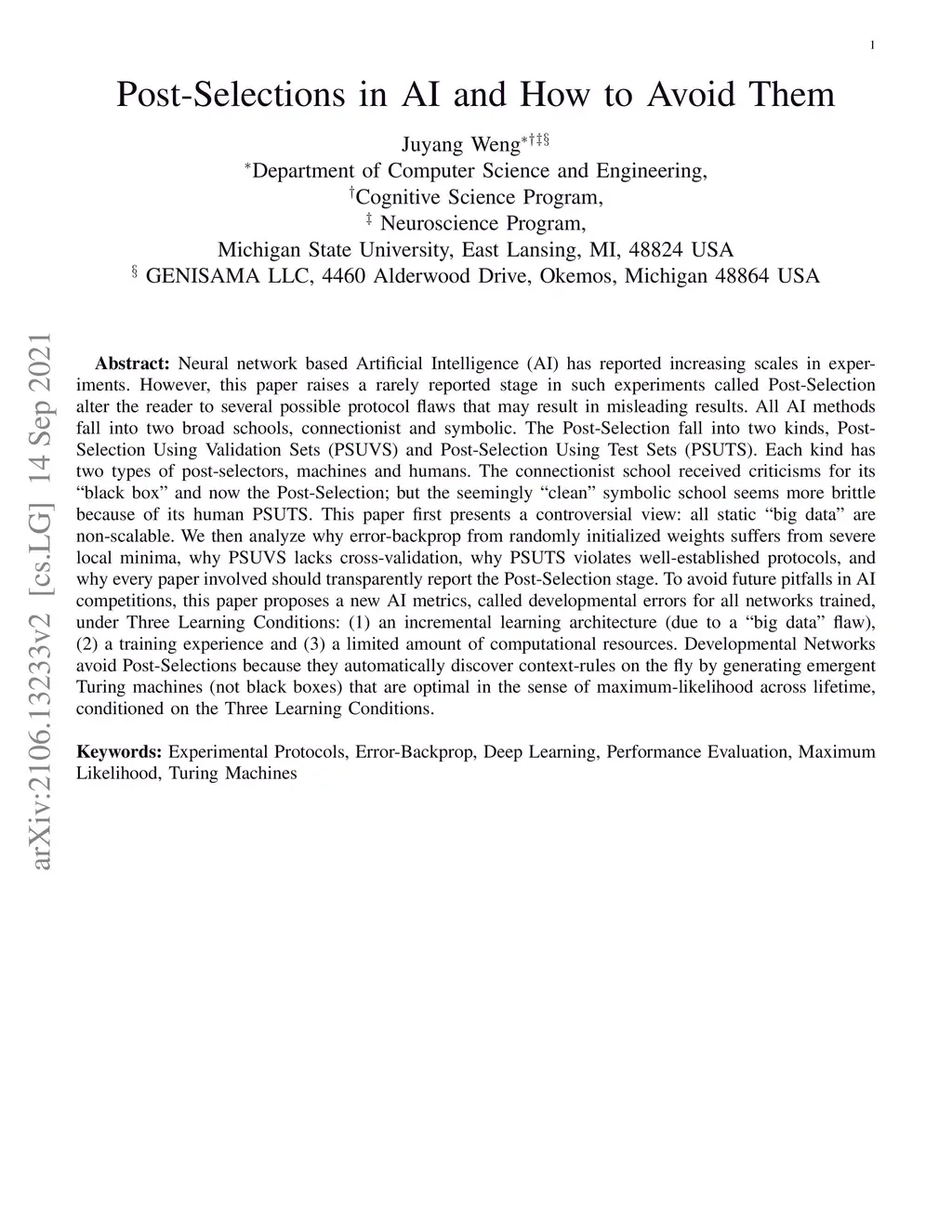 Neural network based Artificial Intelligence (AI) has reported increasing scales in experiments. However, this paper raises a rarely reported stage in such experiments called Post-Selection alter the reader to several possible protocol flaws that may result in misleading results. All AI methods fall into two broad schools, connectionist and symbolic. The Post-Selection fall into two kinds, Post-Selection Using Validation Sets (PSUVS) and Post-Selection Using Test Sets (PSUTS). Each kind has two types of post-selectors, machines and humans. The connectionist school received criticisms for its "black box" and now the Post-Selection; but the seemingly "clean" symbolic school seems more brittle because of its human PSUTS. This paper first presents a controversial view: all static "big data" are non-scalable. We then analyze why error-backprop from randomly initialized weights suffers from severe local minima, why PSUVS lacks cross-validation, why PSUTS violates well-established protocols, and why every paper involved should transparently report the Post-Selection stage. To avoid future pitfalls in AI competitions, this paper proposes a new AI metrics, called developmental errors for all networks trained, under Three Learning Conditions: (1) an incremental learning architecture (due to a "big data" flaw), (2) a training experience and (3) a limited amount of computational resources. Developmental Networks avoid Post-Selections because they automatically discover context-rules on the fly by generating emergent Turing machines (not black boxes) that are optimal in the sense of maximum-likelihood across lifetime, conditioned on the Three Learning Conditions.