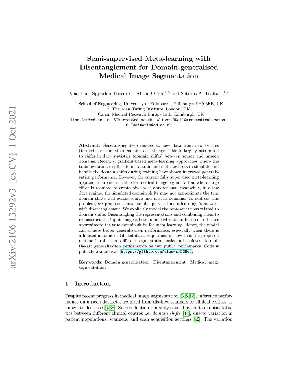 Generalising deep models to new data from new centres (termed here domains) remains a challenge. This is largely attributed to shifts in data statistics (domain shifts) between source and unseen domains. Recently, gradient-based meta-learning approaches where the training data are split into meta-train and meta-test sets to simulate and handle the domain shifts during training have shown improved generalisation performance. However, the current fully supervised meta-learning approaches are not scalable for medical image segmentation, where large effort is required to create pixel-wise annotations. Meanwhile, in a low data regime, the simulated domain shifts may not approximate the true domain shifts well across source and unseen domains. To address this problem, we propose a novel semi-supervised meta-learning framework with disentanglement. We explicitly model the representations related to domain shifts. Disentangling the representations and combining them to reconstruct the input image allows unlabeled data to be used to better approximate the true domain shifts for meta-learning. Hence, the model can achieve better generalisation performance, especially when there is a limited amount of labeled data. Experiments show that the proposed method is robust on different segmentation tasks and achieves state-of-the-art generalisation performance on two public benchmarks.