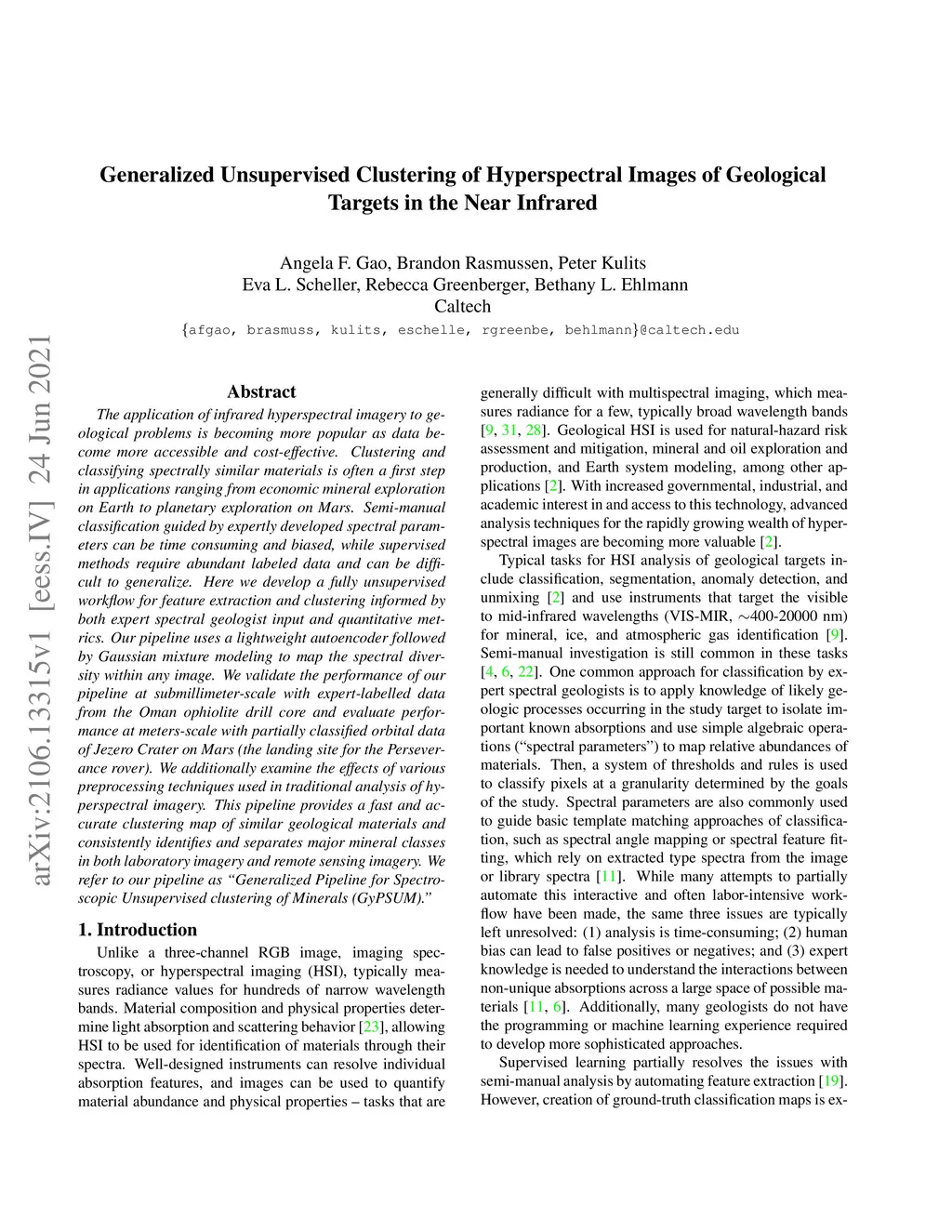 The application of infrared hyperspectral imagery to geological problems is becoming more popular as data become more accessible and cost-effective. Clustering and classifying spectrally similar materials is often a first step in applications ranging from economic mineral exploration on Earth to planetary exploration on Mars. Semi-manual classification guided by expertly developed spectral parameters can be time consuming and biased, while supervised methods require abundant labeled data and can be difficult to generalize. Here we develop a fully unsupervised workflow for feature extraction and clustering informed by both expert spectral geologist input and quantitative metrics. Our pipeline uses a lightweight autoencoder followed by Gaussian mixture modeling to map the spectral diversity within any image. We validate the performance of our pipeline at submillimeter-scale with expert-labelled data from the Oman ophiolite drill core and evaluate performance at meters-scale with partially classified orbital data of Jezero Crater on Mars (the landing site for the Perseverance rover). We additionally examine the effects of various preprocessing techniques used in traditional analysis of hyperspectral imagery. This pipeline provides a fast and accurate clustering map of similar geological materials and consistently identifies and separates major mineral classes in both laboratory imagery and remote sensing imagery. We refer to our pipeline as "Generalized Pipeline for Spectroscopic Unsupervised clustering of Minerals (GyPSUM)."