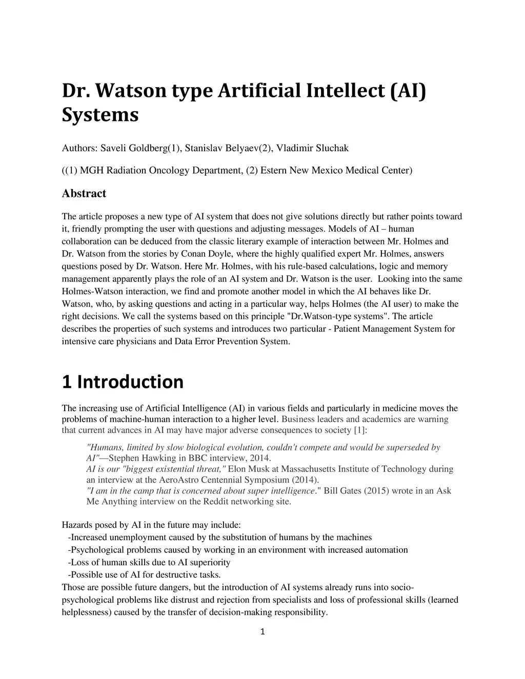 Dr. Watson type Artificial Intellect (AI) Systems