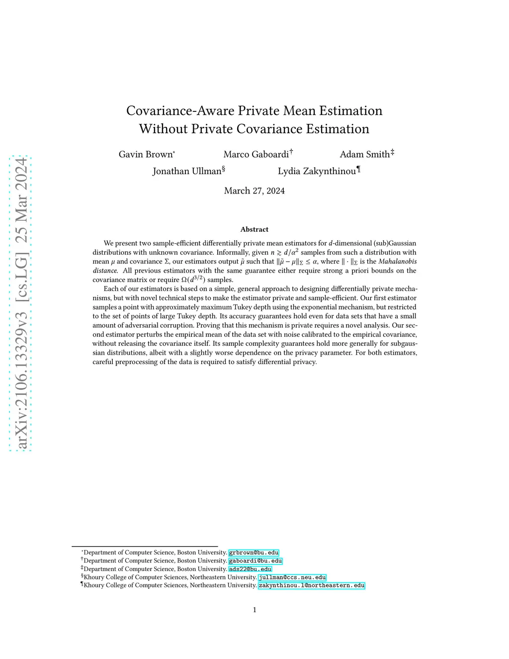 We present two sample-efficient differentially private mean estimators for -dimensional (sub)Gaussian distributions with unknown covariance. Informally, given samples from such a distribution with mean and covariance , our estimators output such that , where is the Mahalanobis distance. All previous estimators with the same guarantee either require strong a priori bounds on the covariance matrix or require samples. Each of our estimators is based on a simple, general approach to designing differentially private mechanisms, but with novel technical steps to make the estimator private and sample-efficient. Our first estimator samples a point with approximately maximum Tukey depth using the exponential mechanism, but restricted to the set of points of large Tukey depth. Its accuracy guarantees hold even for data sets that have a small amount of adversarial corruption. Proving that this mechanism is private requires a novel analysis. Our second estimator perturbs the empirical mean of the data set with noise calibrated to the empirical covariance, without releasing the covariance itself. Its sample complexity guarantees hold more generally for subgaussian distributions, albeit with a slightly worse dependence on the privacy parameter. For both estimators, careful preprocessing of the data is required to satisfy differential privacy.