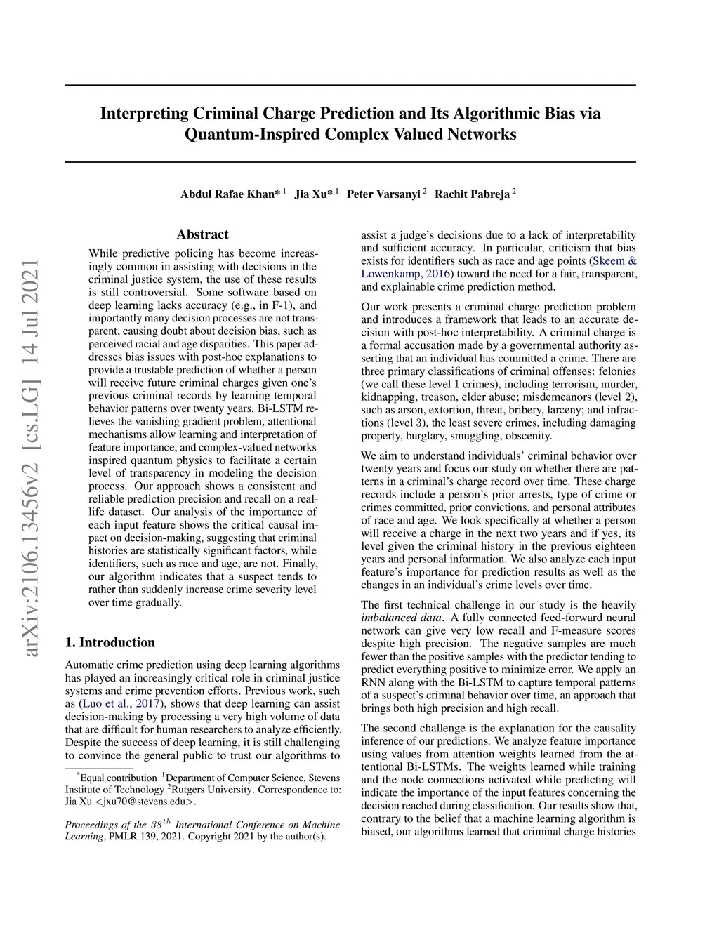 While predictive policing has become increasingly common in assisting with decisions in the criminal justice system, the use of these results is still controversial. Some software based on deep learning lacks accuracy (e.g., in F-1), and importantly many decision processes are not transparent, causing doubt about decision bias, such as perceived racial and age disparities. This paper addresses bias issues with post-hoc explanations to provide a trustable prediction of whether a person will receive future criminal charges given one's previous criminal records by learning temporal behavior patterns over twenty years. Bi-LSTM relieves the vanishing gradient problem, attentional mechanisms allow learning and interpretation of feature importance, and complex-valued networks inspired quantum physics to facilitate a certain level of transparency in modeling the decision process. Our approach shows a consistent and reliable prediction precision and recall on a real-life dataset. Our analysis of the importance of each input feature shows the critical causal impact on decision-making, suggesting that criminal histories are statistically significant factors, while identifiers, such as race and age, are not. Finally, our algorithm indicates that a suspect tends to rather than suddenly increase crime severity level over time gradually.
