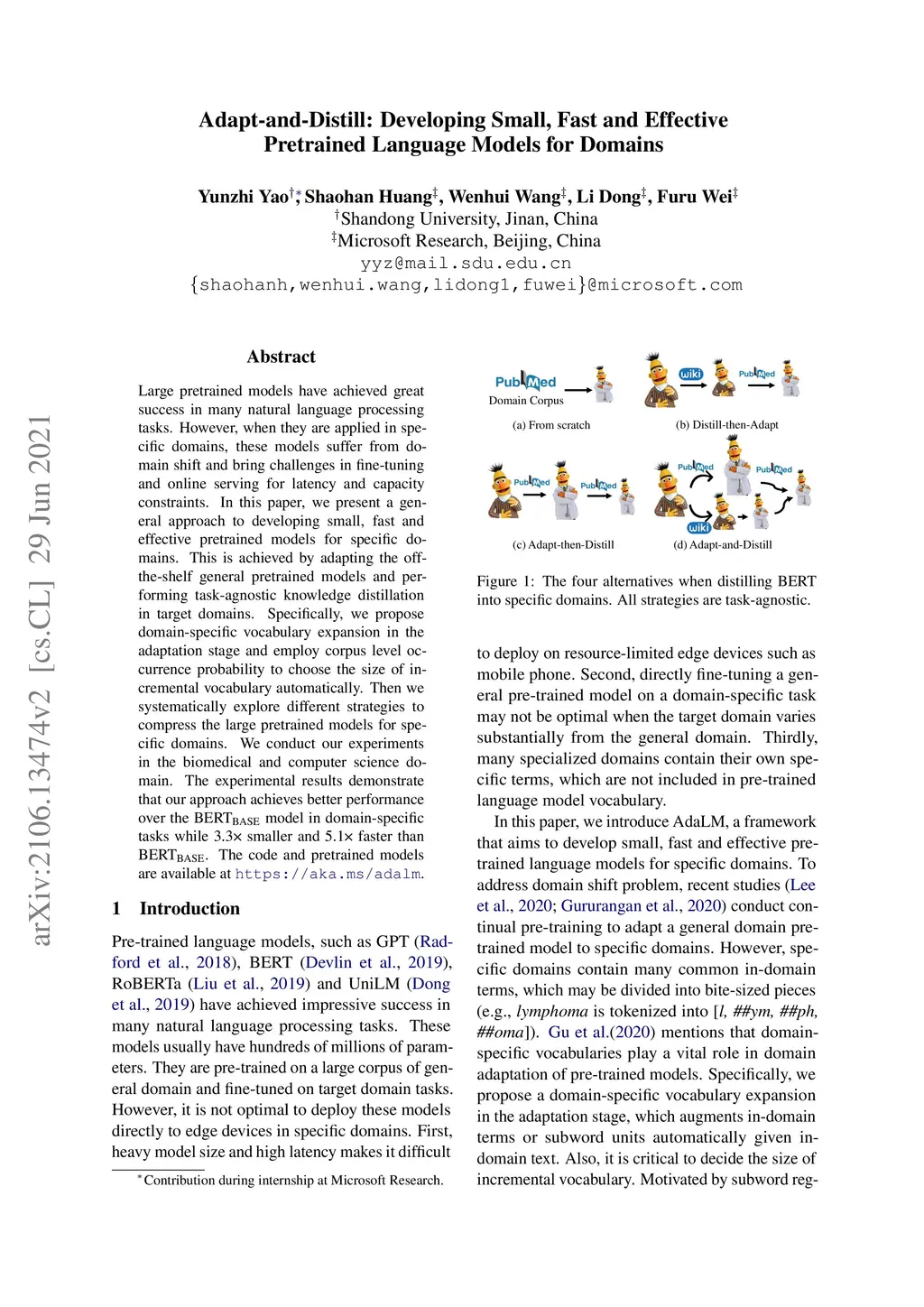 Adapt-and-Distill: Developing Small, Fast and Effective Pretrained