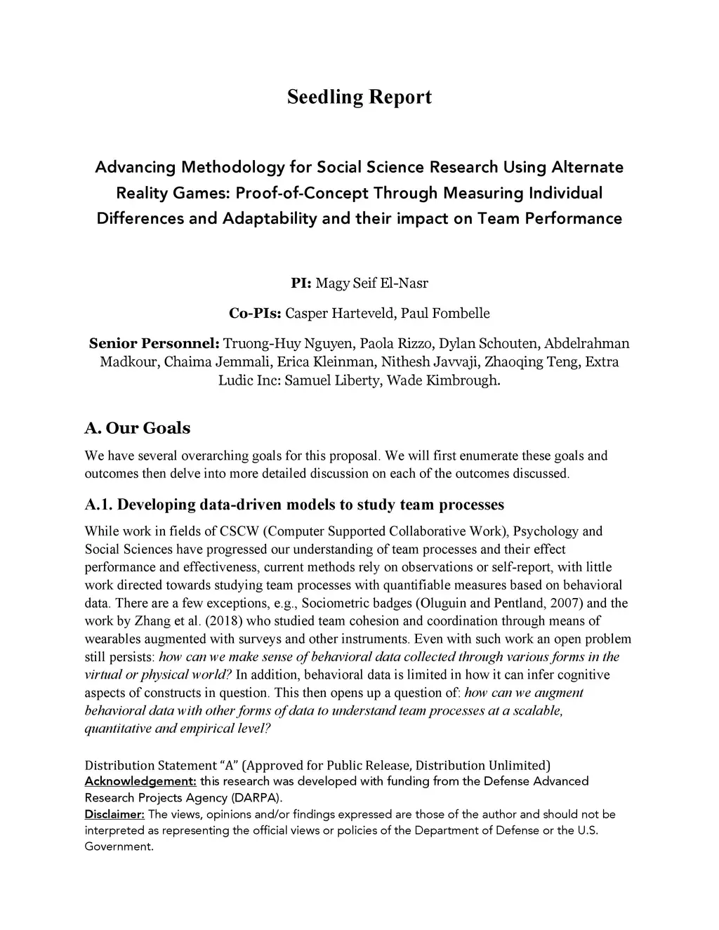 While work in fields of CSCW (Computer Supported Collaborative Work), Psychology and Social Sciences have progressed our understanding of team processes and their effect performance and effectiveness, current methods rely on observations or self-report, with little work directed towards studying team processes with quantifiable measures based on behavioral data. In this report we discuss work tackling this open problem with a focus on understanding individual differences and its effect on team adaptation, and further explore the effect of these factors on team performance as both an outcome and a process. We specifically discuss our contribution in terms of methods that augment survey data and behavioral data that allow us to gain more insight on team performance as well as develop a method to evaluate adaptation and performance across and within a group. To make this problem more tractable we chose to focus on specific types of environments, Alternate Reality Games (ARGs), and for several reasons. First, these types of games involve setups that are similar to a real-world setup, e.g., communication through slack or email. Second, they are more controllable than real environments allowing us to embed stimuli if needed. Lastly, they allow us to collect data needed to understand decisions and communications made through the entire duration of the experience, which makes team processes more transparent than otherwise possible. In this report we discuss the work we did so far and demonstrate the efficacy of the approach.