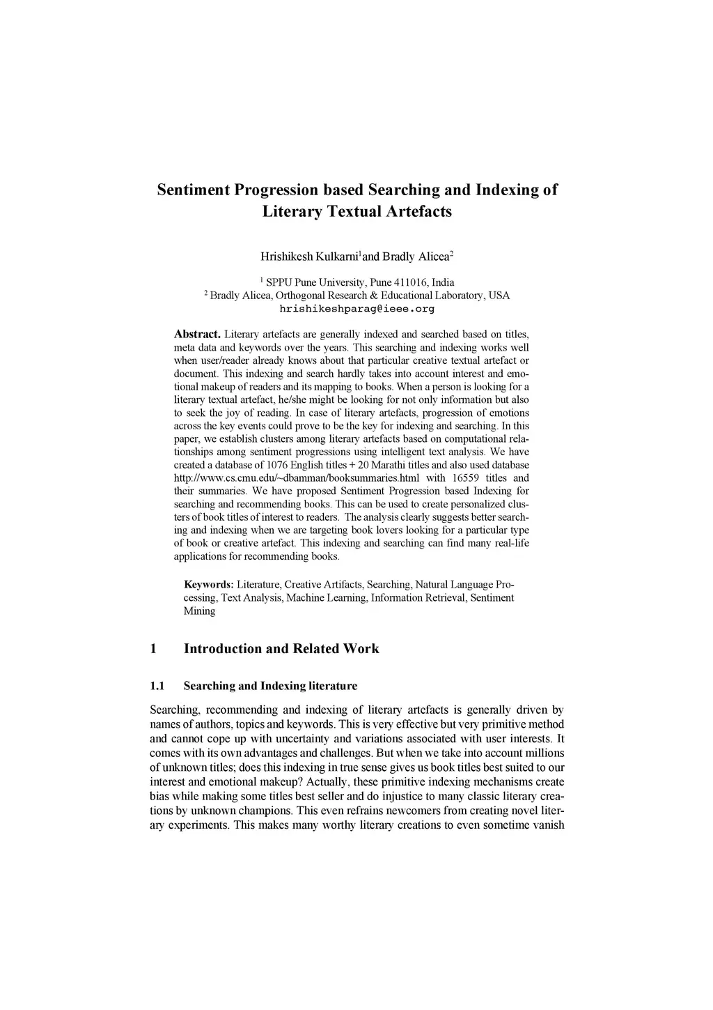 Literary artefacts are generally indexed and searched based on titles, meta data and keywords over the years. This searching and indexing works well when user/reader already knows about that particular creative textual artefact or document. This indexing and search hardly takes into account interest and emotional makeup of readers and its mapping to books. When a person is looking for a literary textual artefact, he/she might be looking for not only information but also to seek the joy of reading. In case of literary artefacts, progression of emotions across the key events could prove to be the key for indexing and searching. In this paper, we establish clusters among literary artefacts based on computational relationships among sentiment progressions using intelligent text analysis. We have created a database of 1076 English titles + 20 Marathi titles and also used database http://www.cs.cmu.edu/~dbamman/booksummaries.html with 16559 titles and their summaries. We have proposed Sentiment Progression based Indexing for searching and recommending books. This can be used to create personalized clusters of book titles of interest to readers. The analysis clearly suggests better searching and indexing when we are targeting book lovers looking for a particular type of book or creative artefact. This indexing and searching can find many real-life applications for recommending books.