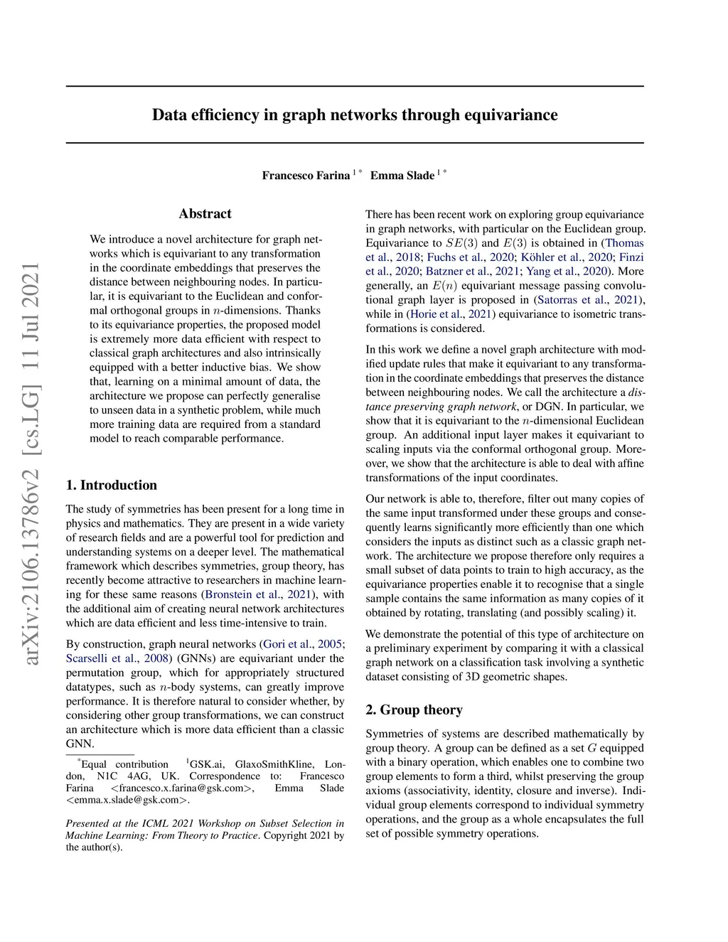 We introduce a novel architecture for graph networks which is equivariant to any transformation in the coordinate embeddings that preserves the distance between neighbouring nodes. In particular, it is equivariant to the Euclidean and conformal orthogonal groups in -dimensions. Thanks to its equivariance properties, the proposed model is extremely more data efficient with respect to classical graph architectures and also intrinsically equipped with a better inductive bias. We show that, learning on a minimal amount of data, the architecture we propose can perfectly generalise to unseen data in a synthetic problem, while much more training data are required from a standard model to reach comparable performance.