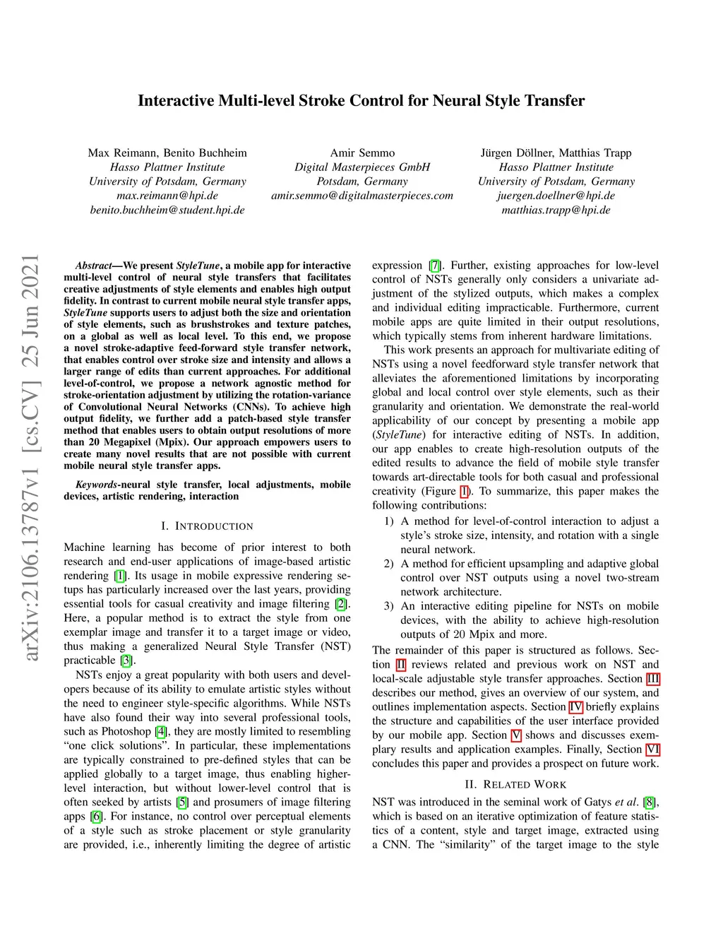We present StyleTune, a mobile app for interactive multi-level control of neural style transfers that facilitates creative adjustments of style elements and enables high output fidelity. In contrast to current mobile neural style transfer apps, StyleTune supports users to adjust both the size and orientation of style elements, such as brushstrokes and texture patches, on a global as well as local level. To this end, we propose a novel stroke-adaptive feed-forward style transfer network, that enables control over stroke size and intensity and allows a larger range of edits than current approaches. For additional level-of-control, we propose a network agnostic method for stroke-orientation adjustment by utilizing the rotation-variance of CNNs. To achieve high output fidelity, we further add a patch-based style transfer method that enables users to obtain output resolutions of more than 20 Megapixel. Our approach empowers users to create many novel results that are not possible with current mobile neural style transfer apps.
