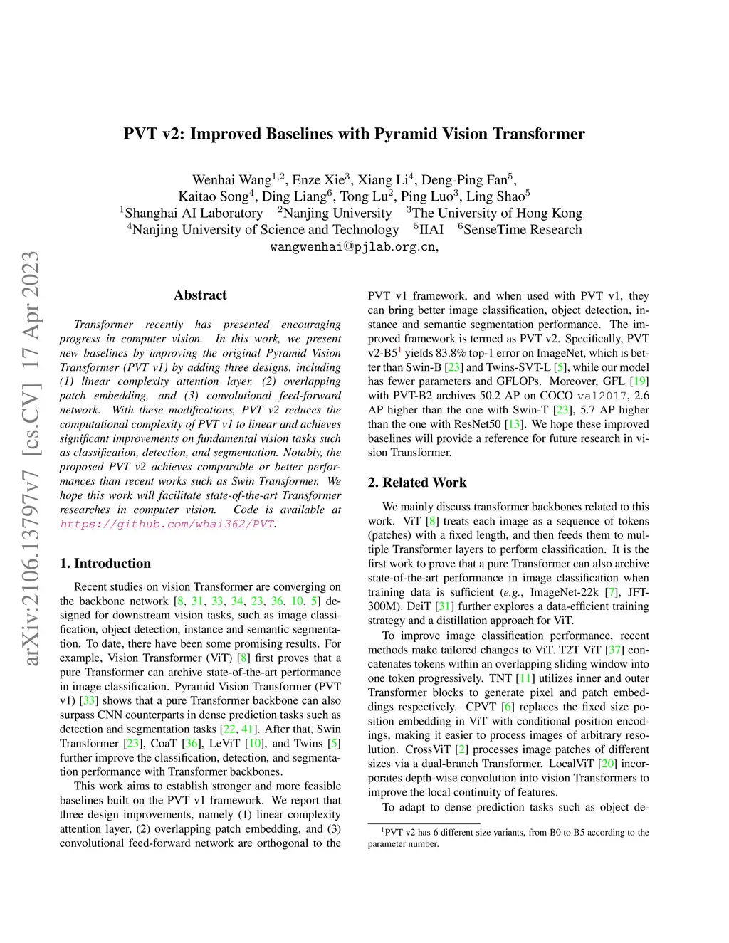 PVT v2: Improved Baselines with Pyramid Vision Transformer
