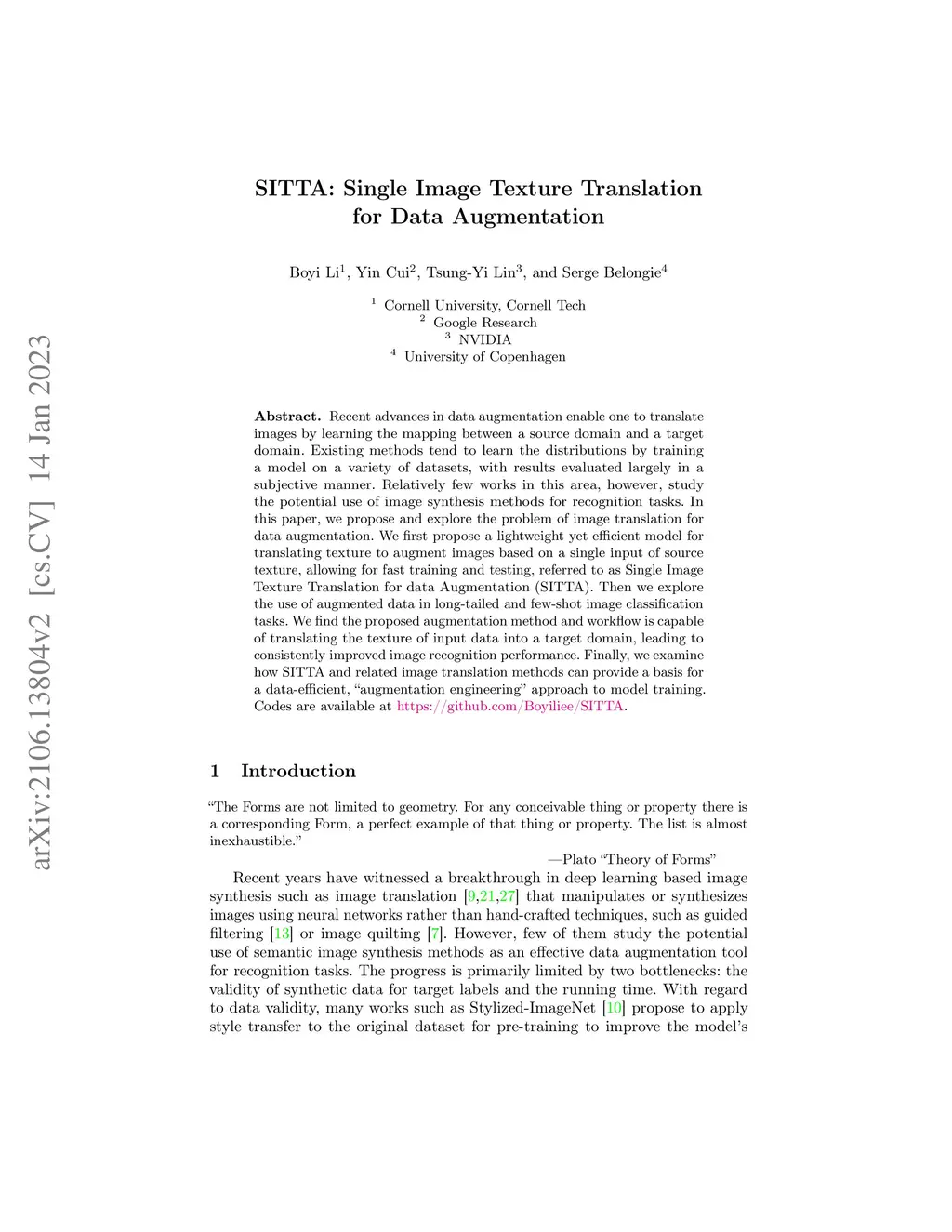 Recent advances in data augmentation enable one to translate images by learning the mapping between a source domain and a target domain. Existing methods tend to learn the distributions by training a model on a variety of datasets, with results evaluated largely in a subjective manner. Relatively few works in this area, however, study the potential use of image synthesis methods for recognition tasks. In this paper, we propose and explore the problem of image translation for data augmentation. We first propose a lightweight yet efficient model for translating texture to augment images based on a single input of source texture, allowing for fast training and testing, referred to as Single Image Texture Translation for data Augmentation (SITTA). Then we explore the use of augmented data in long-tailed and few-shot image classification tasks. We find the proposed augmentation method and workflow is capable of translating the texture of input data into a target domain, leading to consistently improved image recognition performance. Finally, we examine how SITTA and related image translation methods can provide a basis for a data-efficient, "augmentation engineering" approach to model training. Codes are available at https://github.com/Boyiliee/SITTA.