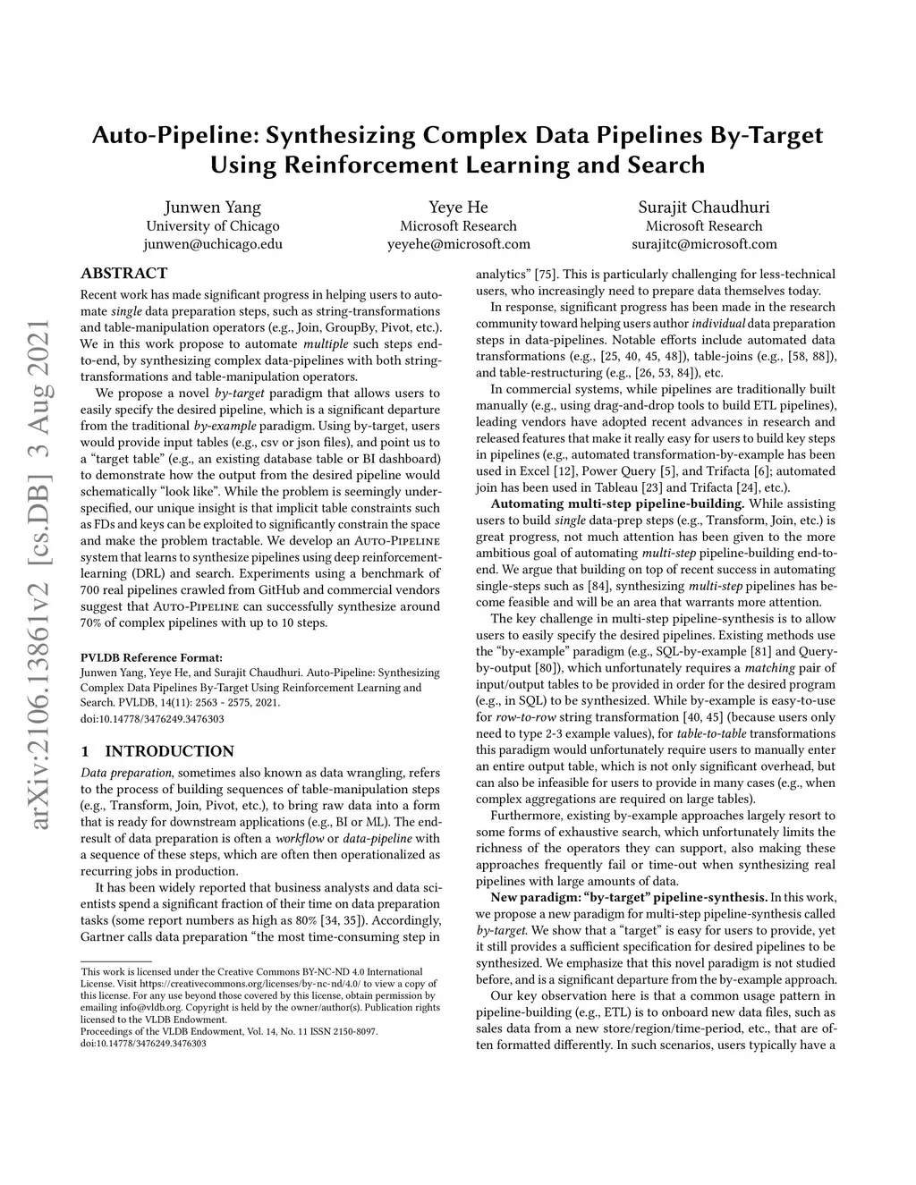 Recent work has made significant progress in helping users to automate single data preparation steps, such as string-transformations and table-manipulation operators (e.g., Join, GroupBy, Pivot, etc.). We in this work propose to automate multiple such steps end-to-end, by synthesizing complex data pipelines with both string transformations and table-manipulation operators. We propose a novel "by-target" paradigm that allows users to easily specify the desired pipeline, which is a significant departure from the traditional by-example paradigm. Using by-target, users would provide input tables (e.g., csv or json files), and point us to a "target table" (e.g., an existing database table or BI dashboard) to demonstrate how the output from the desired pipeline would schematically "look like". While the problem is seemingly underspecified, our unique insight is that implicit table constraints such as FDs and keys can be exploited to significantly constrain the space to make the problem tractable. We develop an Auto-Pipeline system that learns to synthesize pipelines using reinforcement learning and search. Experiments on large numbers of real pipelines crawled from GitHub suggest that Auto-Pipeline can successfully synthesize 60-70% of these complex pipelines with up to 10 steps.