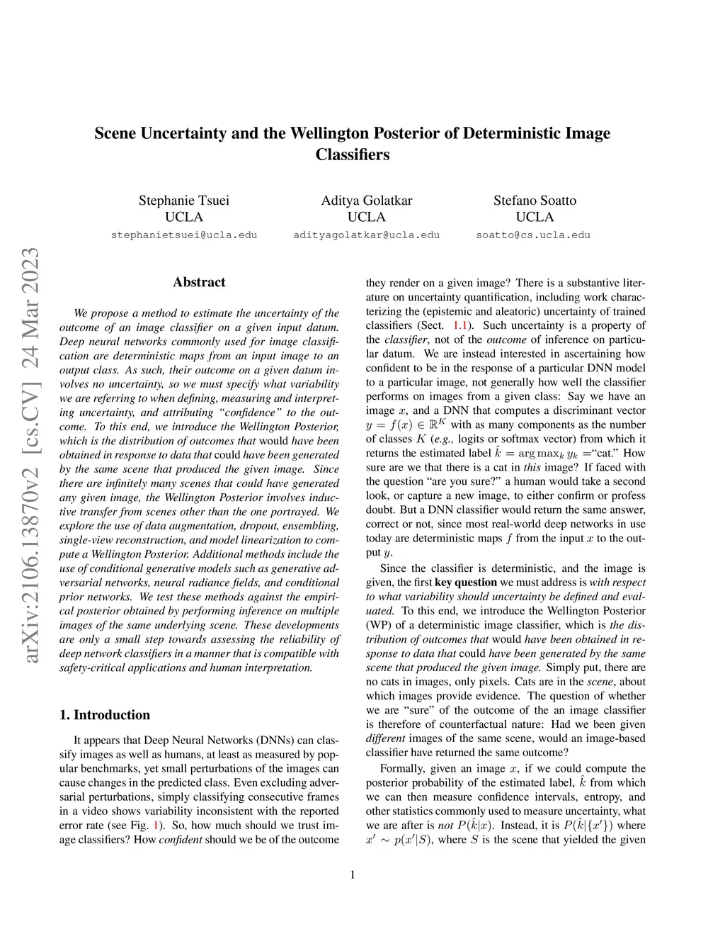 We propose a method to estimate the uncertainty of the outcome of an image classifier on a given input datum. Deep neural networks commonly used for image classification are deterministic maps from an input image to an output class. As such, their outcome on a given datum involves no uncertainty, so we must specify what variability we are referring to when defining, measuring and interpreting uncertainty, and attributing "confidence" to the outcome. To this end, we introduce the Wellington Posterior, which is the distribution of outcomes that would have been obtained in response to data that could have been generated by the same scene that produced the given image. Since there are infinitely many scenes that could have generated any given image, the Wellington Posterior involves inductive transfer from scenes other than the one portrayed. We explore the use of data augmentation, dropout, ensembling, single-view reconstruction, and model linearization to compute a Wellington Posterior. Additional methods include the use of conditional generative models such as generative adversarial networks, neural radiance fields, and conditional prior networks. We test these methods against the empirical posterior obtained by performing inference on multiple images of the same underlying scene. These developments are only a small step towards assessing the reliability of deep network classifiers in a manner that is compatible with safety-critical applications and human interpretation.