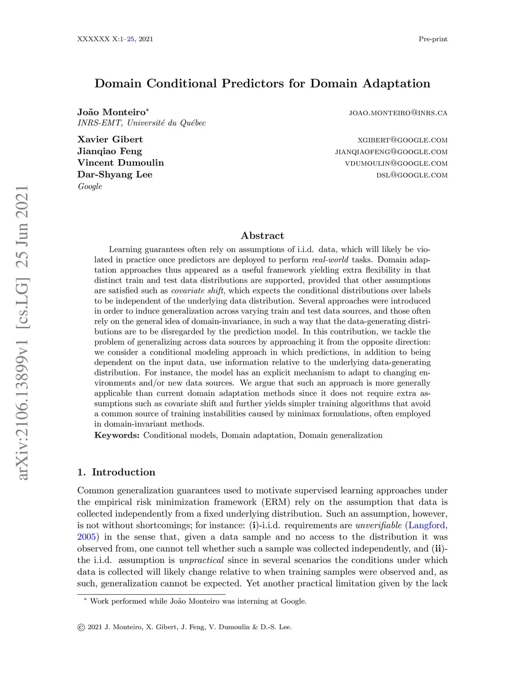 Learning guarantees often rely on assumptions of i.i.d. data, which will likely be violated in practice once predictors are deployed to perform real-world tasks. Domain adaptation approaches thus appeared as a useful framework yielding extra flexibility in that distinct train and test data distributions are supported, provided that other assumptions are satisfied such as covariate shift, which expects the conditional distributions over labels to be independent of the underlying data distribution. Several approaches were introduced in order to induce generalization across varying train and test data sources, and those often rely on the general idea of domain-invariance, in such a way that the data-generating distributions are to be disregarded by the prediction model. In this contribution, we tackle the problem of generalizing across data sources by approaching it from the opposite direction: we consider a conditional modeling approach in which predictions, in addition to being dependent on the input data, use information relative to the underlying data-generating distribution. For instance, the model has an explicit mechanism to adapt to changing environments and/or new data sources. We argue that such an approach is more generally applicable than current domain adaptation methods since it does not require extra assumptions such as covariate shift and further yields simpler training algorithms that avoid a common source of training instabilities caused by minimax formulations, often employed in domain-invariant methods.
