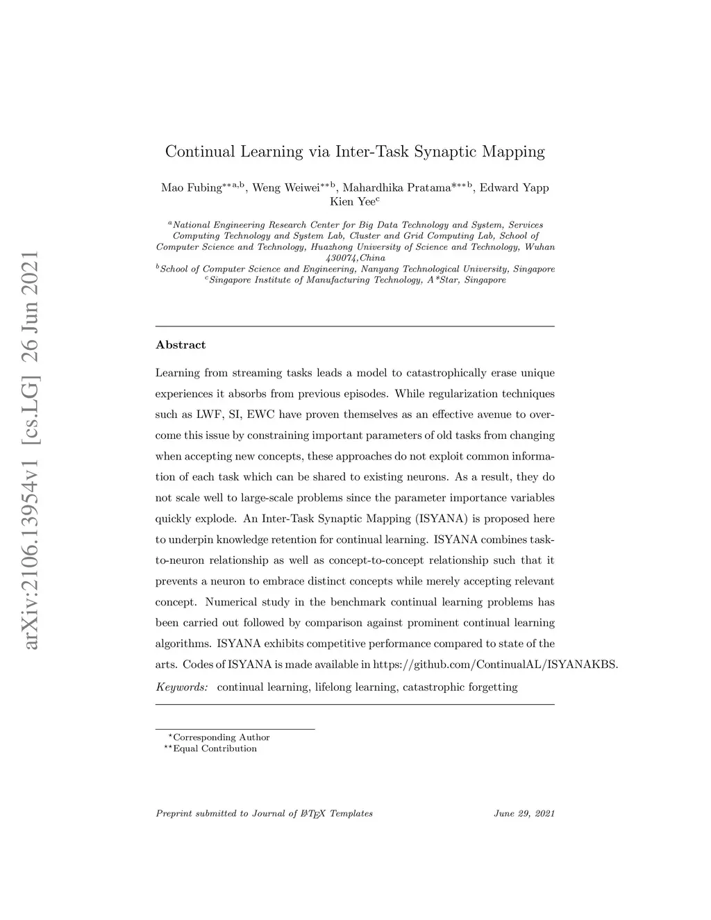 Learning from streaming tasks leads a model to catastrophically erase unique experiences it absorbs from previous episodes. While regularization techniques such as LWF, SI, EWC have proven themselves as an effective avenue to overcome this issue by constraining important parameters of old tasks from changing when accepting new concepts, these approaches do not exploit common information of each task which can be shared to existing neurons. As a result, they do not scale well to large-scale problems since the parameter importance variables quickly explode. An Inter-Task Synaptic Mapping (ISYANA) is proposed here to underpin knowledge retention for continual learning. ISYANA combines task-to-neuron relationship as well as concept-to-concept relationship such that it prevents a neuron to embrace distinct concepts while merely accepting relevant concept. Numerical study in the benchmark continual learning problems has been carried out followed by comparison against prominent continual learning algorithms. ISYANA exhibits competitive performance compared to state of the arts. Codes of ISYANA is made available in \url{https://github.com/ContinualAL/ISYANAKBS}.