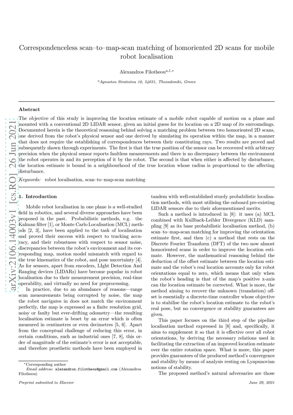 The objective of this study is improving the location estimate of a mobile robot capable of motion on a plane and mounted with a conventional 2D LIDAR sensor, given an initial guess for its location on a 2D map of its surroundings. Documented herein is the theoretical reasoning behind solving a matching problem between two homoriented 2D scans, one derived from the robot's physical sensor and one derived by simulating its operation within the map, in a manner that does not require the establishing of correspondences between their constituting rays. Two results are proved and subsequently shown through experiments. The first is that the true position of the sensor can be recovered with arbitrary precision when the physical sensor reports faultless measurements and there is no discrepancy between the environment the robot operates in and its perception of it by the robot. The second is that when either is affected by disturbance, the location estimate is bound in a neighbourhood of the true location whose radius is proportional to the affecting disturbance.