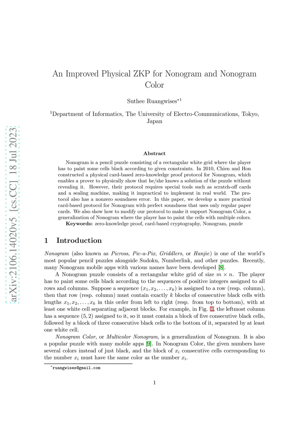 Nonogram is a pencil puzzle consisting of a rectangular white grid where the player has to paint some cells black according to given constraints. In 2010, Chien and Hon constructed a physical card-based zero-knowledge proof protocol for Nonogram, which enables a prover to physically show that he/she knows a solution of the puzzle without revealing it. However, their protocol requires special tools such as scratch-off cards and a sealing machine, making it impractical to implement in real world. The protocol also has a nonzero soundness error. In this paper, we develop a more practical card-based protocol for Nonogram with perfect soundness that uses only regular paper cards. We also show how to modify our protocol to make it support Nonogram Color, a generalization of Nonogram where the player has to paint the cells with multiple colors.