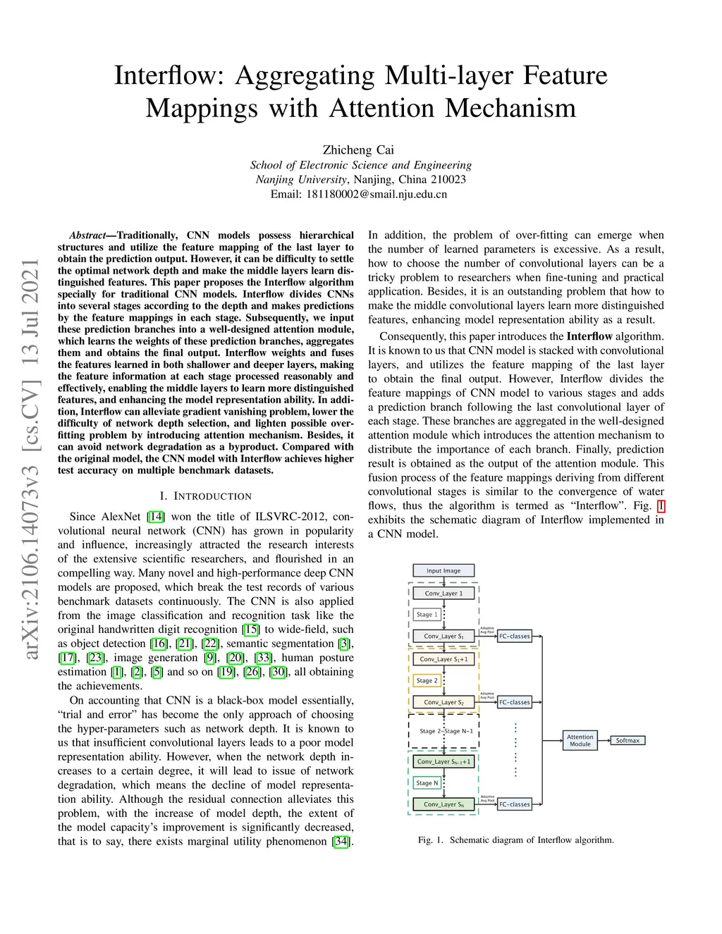 Traditionally, CNN models possess hierarchical structures and utilize the feature mapping of the last layer to obtain the prediction output. However, it can be difficulty to settle the optimal network depth and make the middle layers learn distinguished features. This paper proposes the Interflow algorithm specially for traditional CNN models. Interflow divides CNNs into several stages according to the depth and makes predictions by the feature mappings in each stage. Subsequently, we input these prediction branches into a well-designed attention module, which learns the weights of these prediction branches, aggregates them and obtains the final output. Interflow weights and fuses the features learned in both shallower and deeper layers, making the feature information at each stage processed reasonably and effectively, enabling the middle layers to learn more distinguished features, and enhancing the model representation ability. In addition, Interflow can alleviate gradient vanishing problem, lower the difficulty of network depth selection, and lighten possible over-fitting problem by introducing attention mechanism. Besides, it can avoid network degradation as a byproduct. Compared with the original model, the CNN model with Interflow achieves higher test accuracy on multiple benchmark datasets.