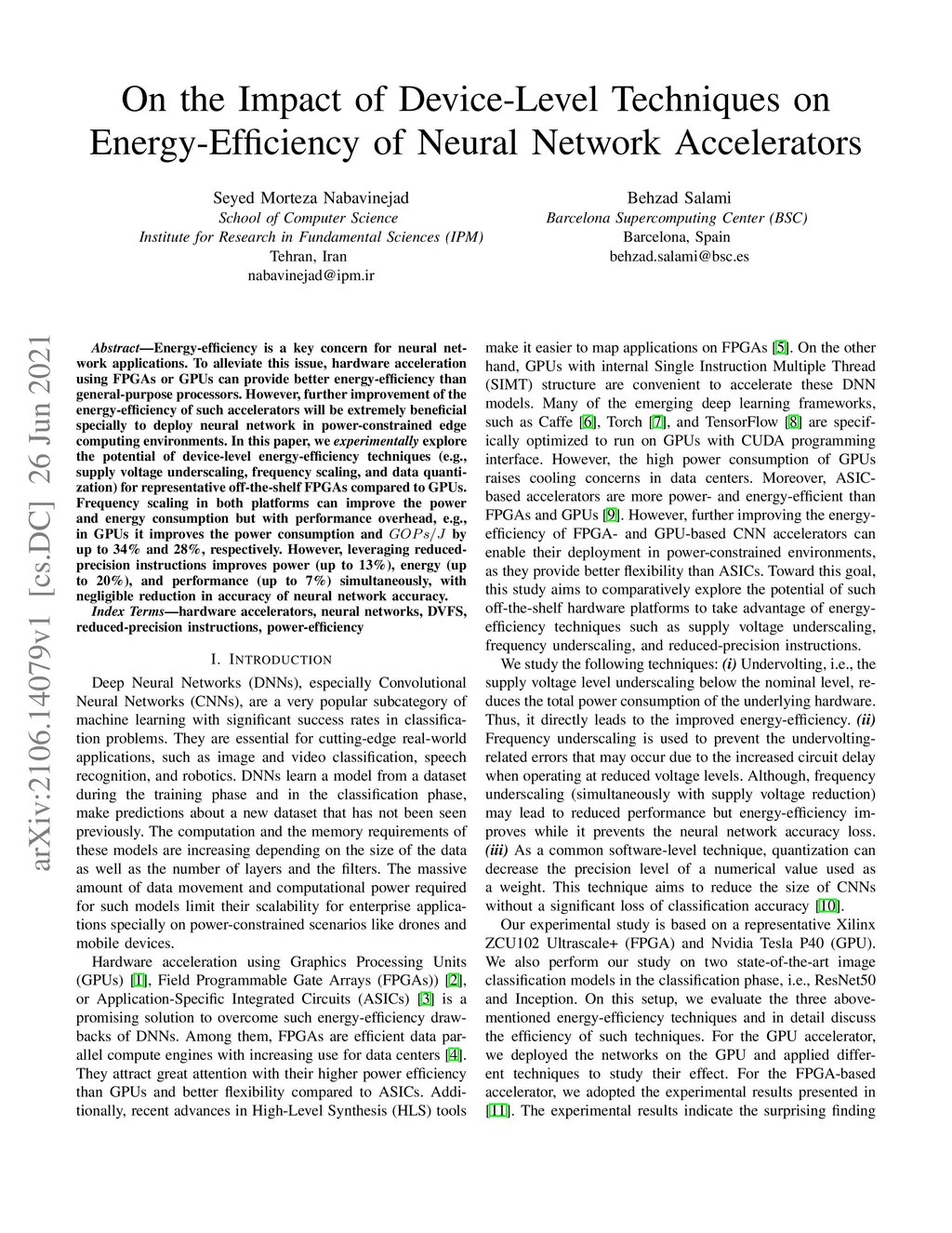 Energy-efficiency is a key concern for neural network applications. To alleviate this issue, hardware acceleration using FPGAs or GPUs can provide better energy-efficiency than general-purpose processors. However, further improvement of the energy-efficiency of such accelerators will be extremely beneficial specially to deploy neural network in power-constrained edge computing environments. In this paper, we experimentally explore the potential of device-level energy-efficiency techniques (e.g.,supply voltage underscaling, frequency scaling, and data quantization) for representative off-the-shelf FPGAs compared to GPUs. Frequency scaling in both platforms can improve the power and energy consumption but with performance overhead, e.g.,in GPUs it improves the power consumption and GOPs/J by up to 34% and 28%, respectively. However, leveraging reduced-precision instructions improves power (up to 13%), energy (up to 20%), and performance (up to 7%) simultaneously, with negligible reduction in accuracy of neural network accuracy.