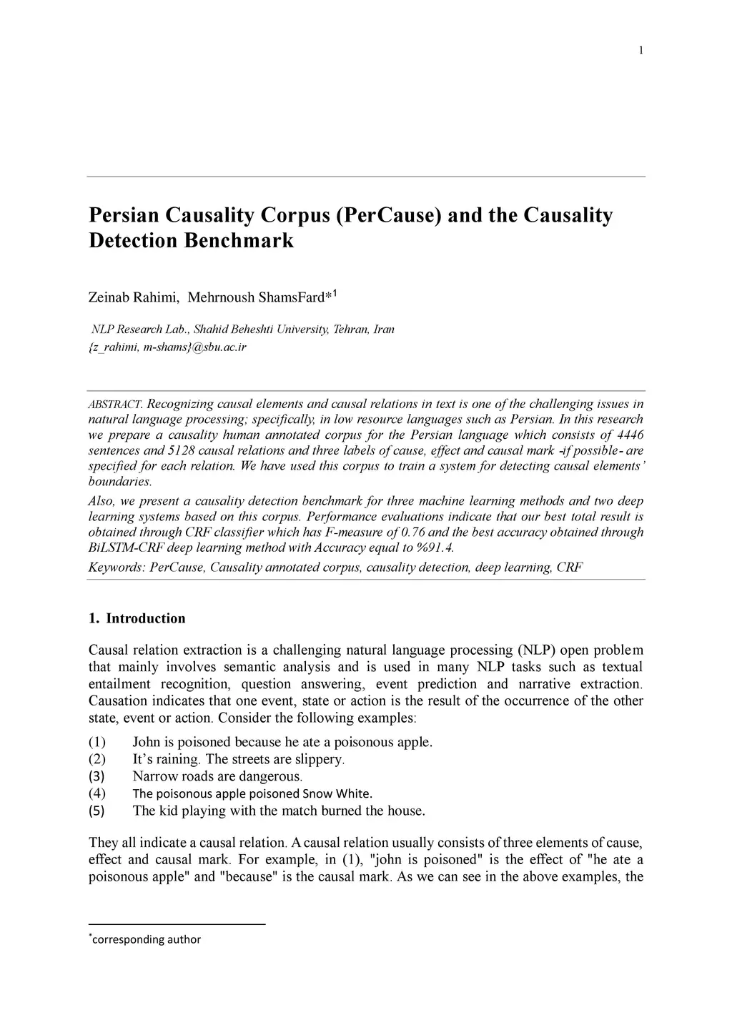 Recognizing causal elements and causal relations in text is one of the challenging issues in natural language processing; specifically, in low resource languages such as Persian. In this research we prepare a causality human annotated corpus for the Persian language which consists of 4446 sentences and 5128 causal relations and three labels of cause, effect and causal mark -- if possibl -- are specified for each relation. We have used this corpus to train a system for detecting causal elements boundaries. Also, we present a causality detection benchmark for three machine learning methods and two deep learning systems based on this corpus. Performance evaluations indicate that our best total result is obtained through CRF classifier which has F-measure of 0.76 and the best accuracy obtained through Bi-LSTM-CRF deep learning method with Accuracy equal to %91.4.