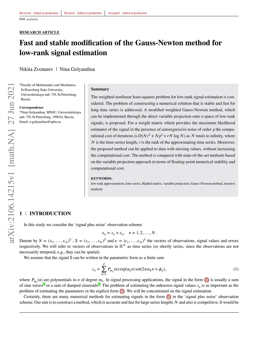 The weighted nonlinear least-squares problem for low-rank signal estimation is considered. The problem of constructing a numerical solution that is stable and fast for long time series is addressed. A modified weighted Gauss-Newton method, which can be implemented through the direct variable projection onto a space of low-rank signals, is proposed. For a weight matrix which provides the maximum likelihood estimator of the signal in the presence of autoregressive noise of order the computational cost of iterations is as tends to infinity, where is the time-series length, is the rank of the approximating time series. Moreover, the proposed method can be applied to data with missing values, without increasing the computational cost. The method is compared with state-of-the-art methods based on the variable projection approach in terms of floating-point numerical stability and computational cost.