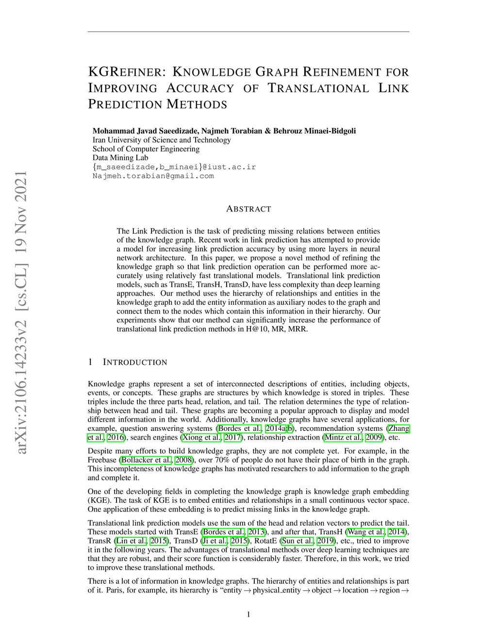 The Link Prediction is the task of predicting missing relations between entities of the knowledge graph. Recent work in link prediction has attempted to provide a model for increasing link prediction accuracy by using more layers in neural network architecture. In this paper, we propose a novel method of refining the knowledge graph so that link prediction operation can be performed more accurately using relatively fast translational models. Translational link prediction models, such as TransE, TransH, TransD, have less complexity than deep learning approaches. Our method uses the hierarchy of relationships and entities in the knowledge graph to add the entity information as auxiliary nodes to the graph and connect them to the nodes which contain this information in their hierarchy. Our experiments show that our method can significantly increase the performance of translational link prediction methods in H@10, MR, MRR.