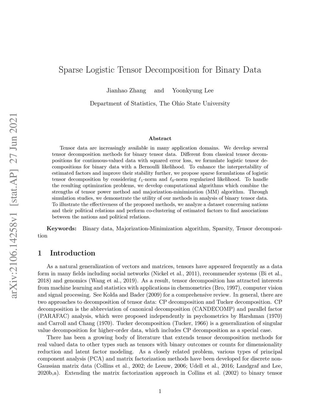 Tensor data are increasingly available in many application domains. We develop several tensor decomposition methods for binary tensor data. Different from classical tensor decompositions for continuous-valued data with squared error loss, we formulate logistic tensor decompositions for binary data with a Bernoulli likelihood. To enhance the interpretability of estimated factors and improve their stability further, we propose sparse formulations of logistic tensor decomposition by considering -norm and -norm regularized likelihood. To handle the resulting optimization problems, we develop computational algorithms which combine the strengths of tensor power method and majorization-minimization (MM) algorithm. Through simulation studies, we demonstrate the utility of our methods in analysis of binary tensor data. To illustrate the effectiveness of the proposed methods, we analyze a dataset concerning nations and their political relations and perform co-clustering of estimated factors to find associations between the nations and political relations.