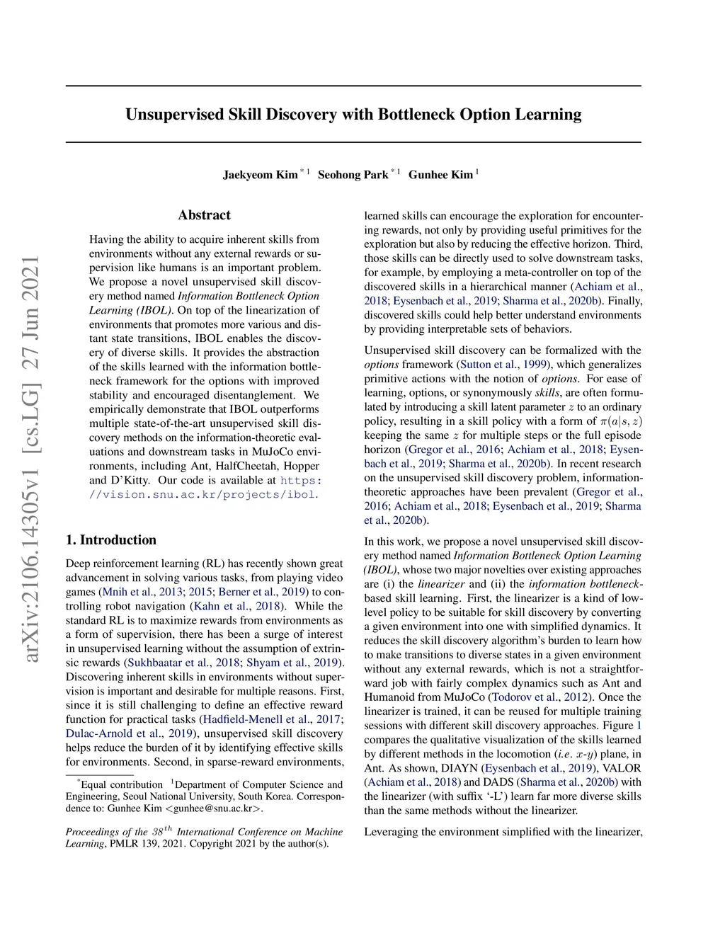 Having the ability to acquire inherent skills from environments without any external rewards or supervision like humans is an important problem. We propose a novel unsupervised skill discovery method named Information Bottleneck Option Learning (IBOL). On top of the linearization of environments that promotes more various and distant state transitions, IBOL enables the discovery of diverse skills. It provides the abstraction of the skills learned with the information bottleneck framework for the options with improved stability and encouraged disentanglement. We empirically demonstrate that IBOL outperforms multiple state-of-the-art unsupervised skill discovery methods on the information-theoretic evaluations and downstream tasks in MuJoCo environments, including Ant, HalfCheetah, Hopper and D'Kitty.